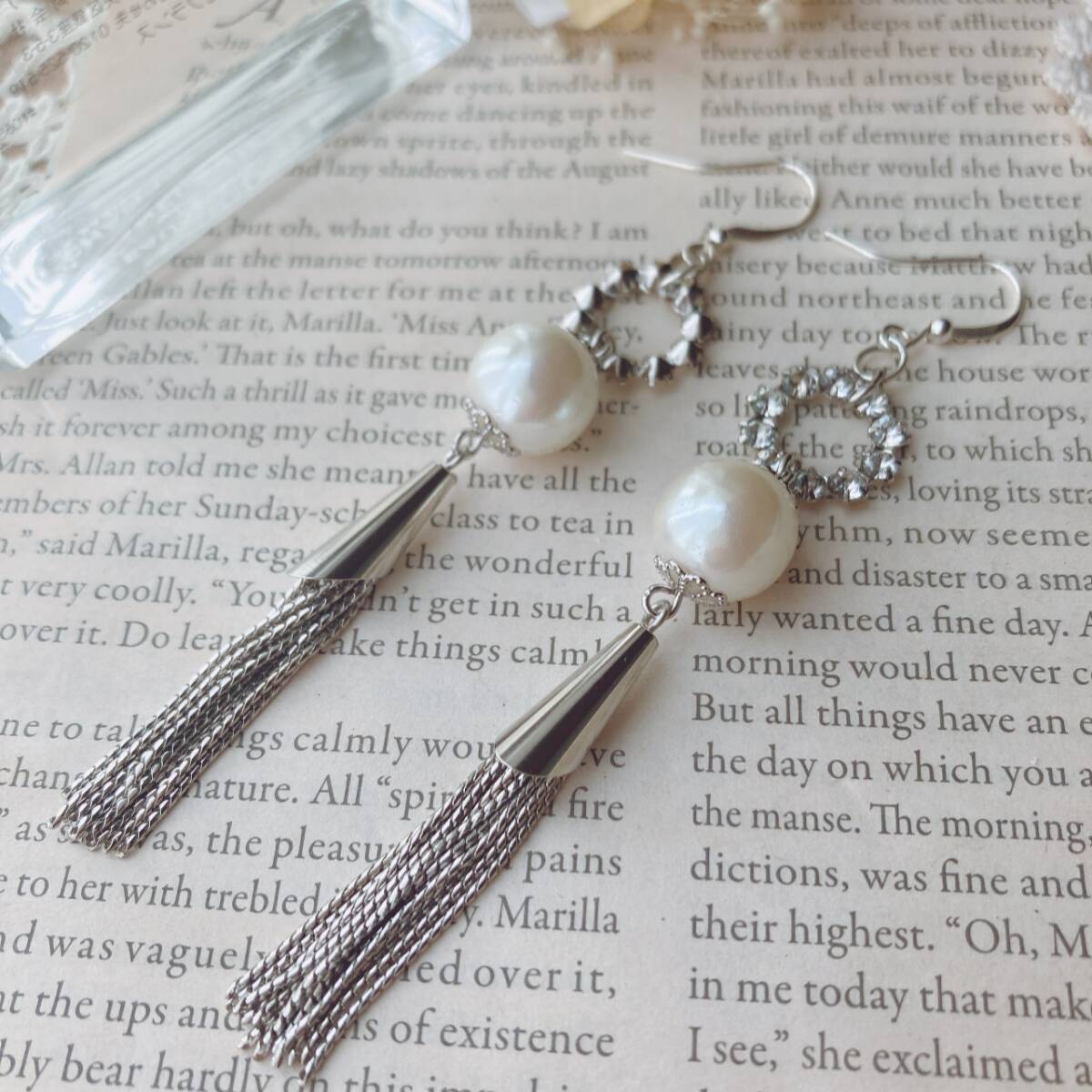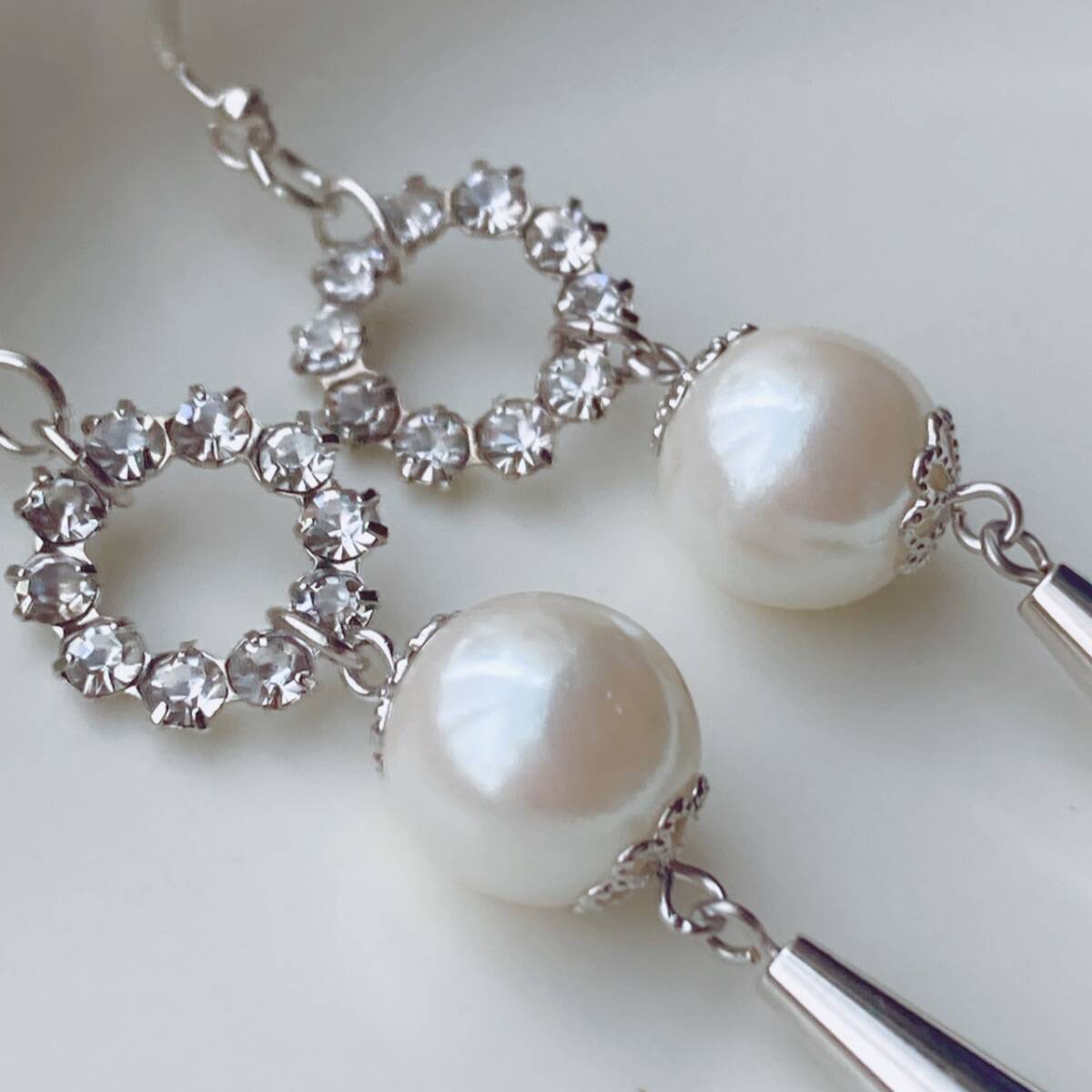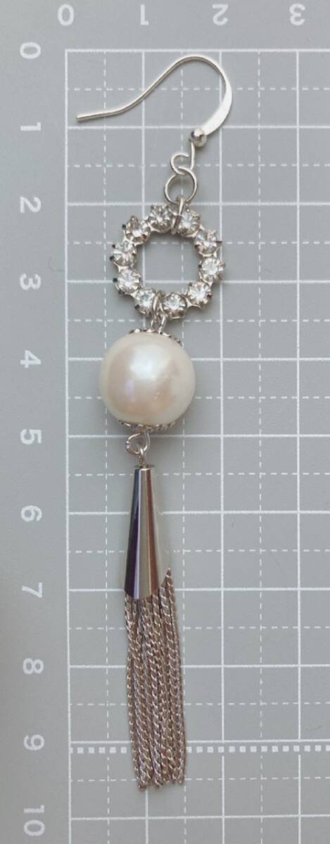 ピアス ラインストーン 大玉パール 一粒 タッセル シルバートーン ゆらゆら 美品☆vintage jewelry accessories F0141