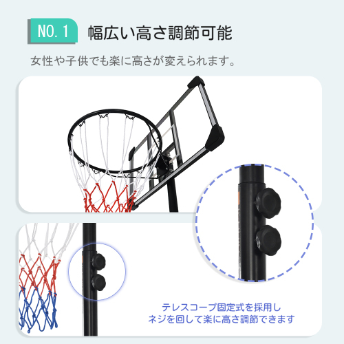 • 【幅広い高さ調節可能】240から270cmまで六段階の調節可能で、子供にも大人にも適応しております。 テレスコープ固定式を採用し、ネジを回して楽に高さ調節できます。