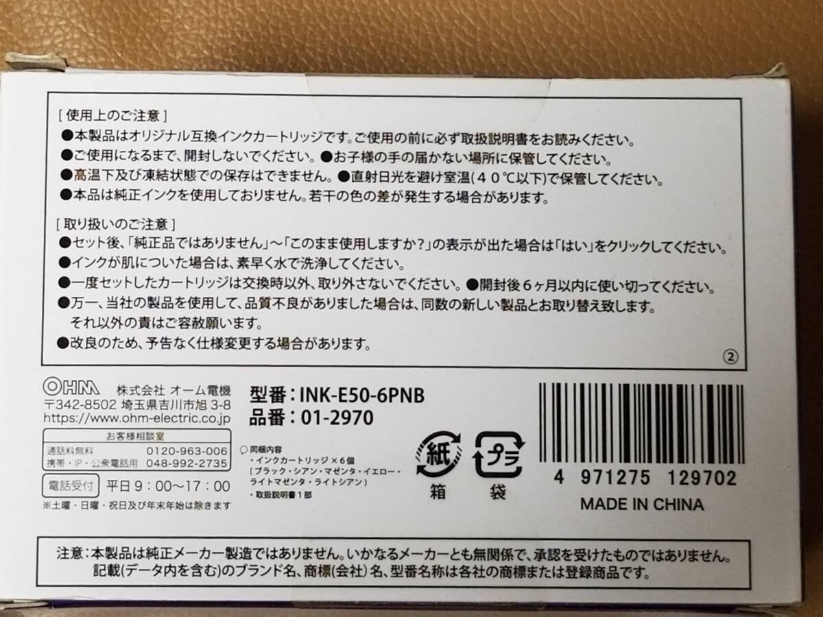 エプソンIC6CL50互換 染料6色パック、OHM製 INK-E50-6PNB 新品未使用品となります。