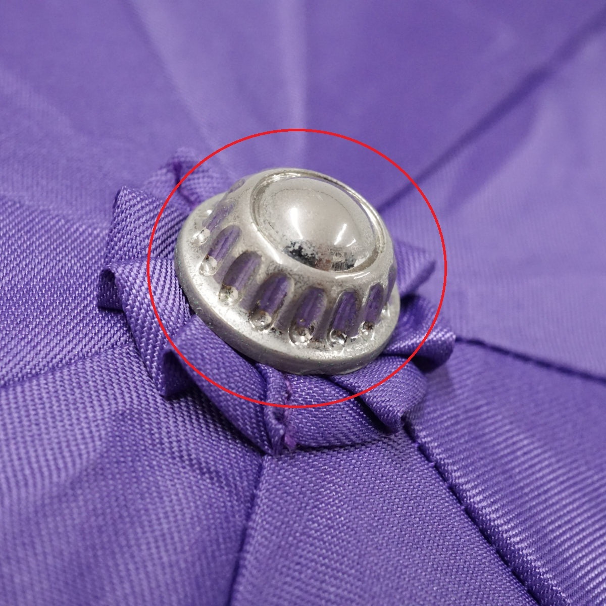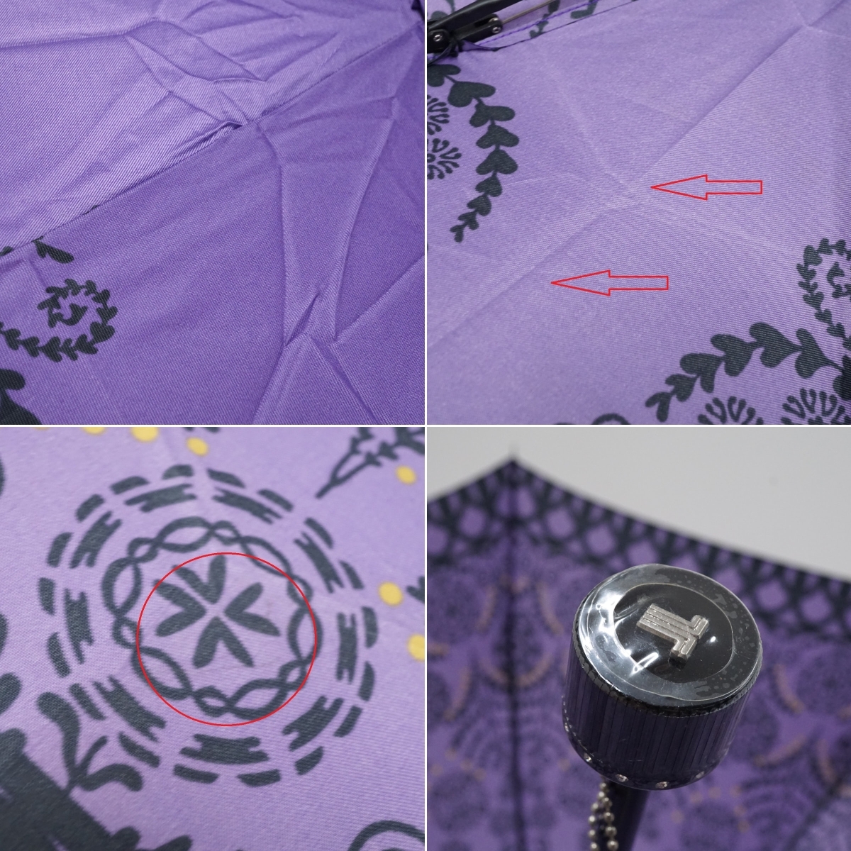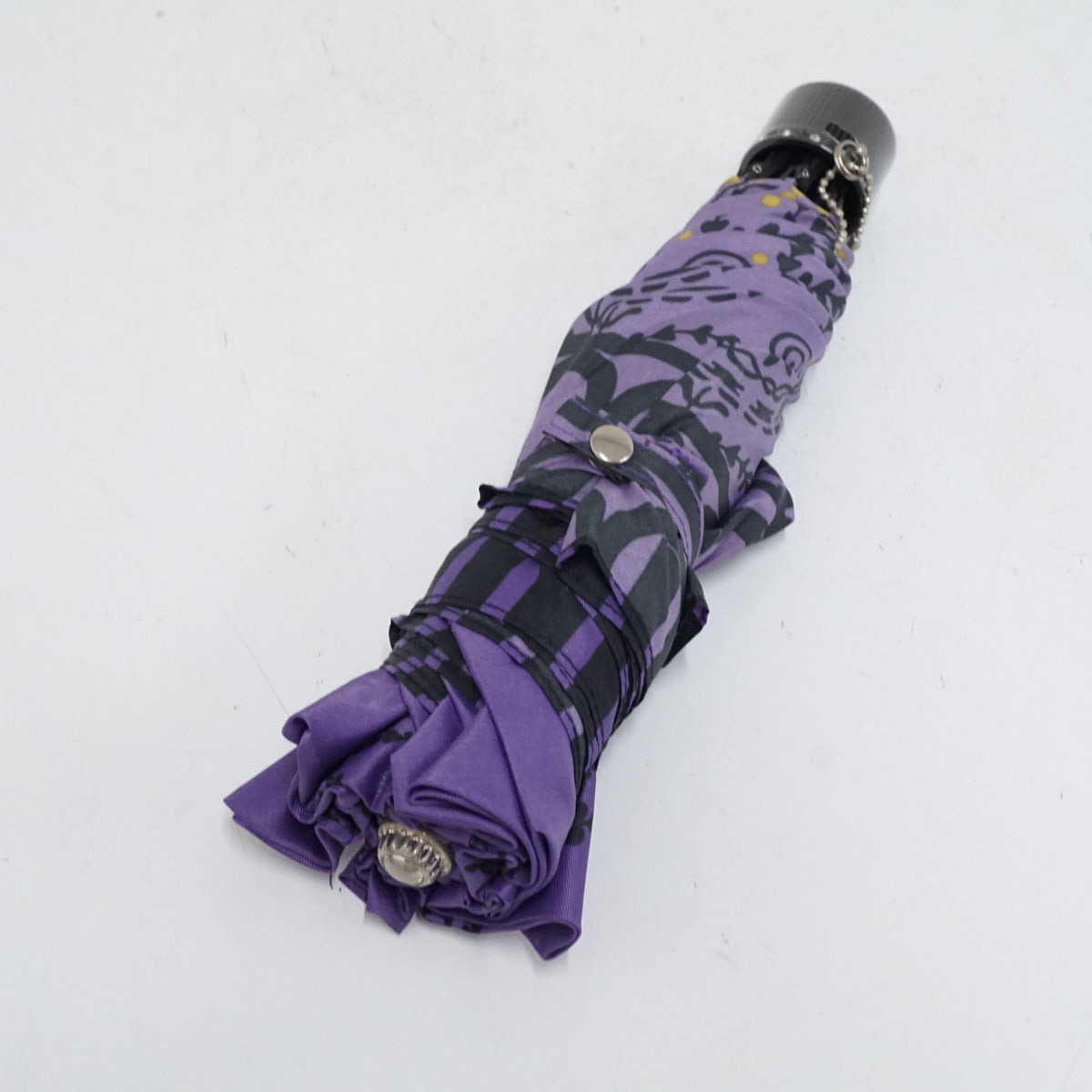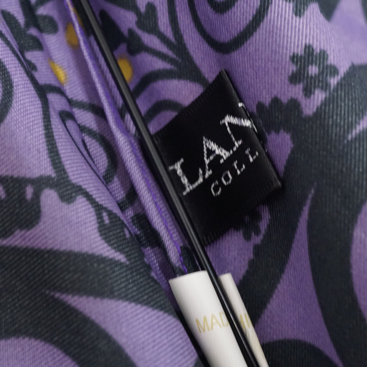 鮮やかなパープルの生地に、ブラックで草花や幾何学模様がプリントされた折りたたみ傘です。