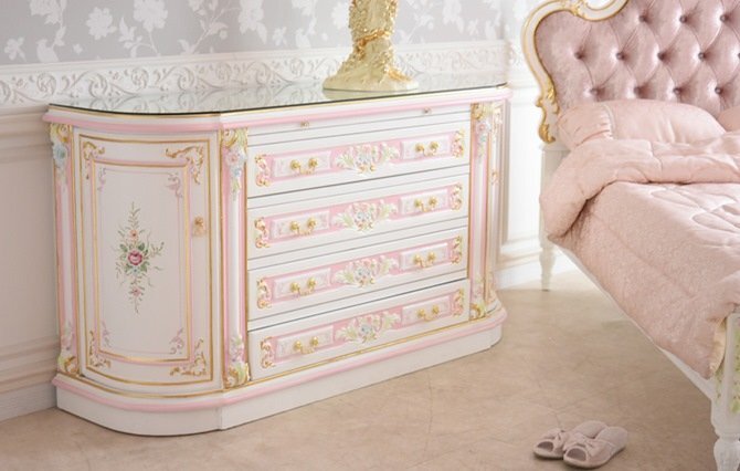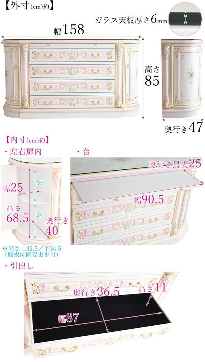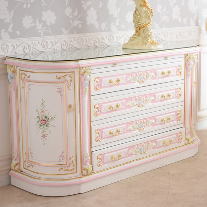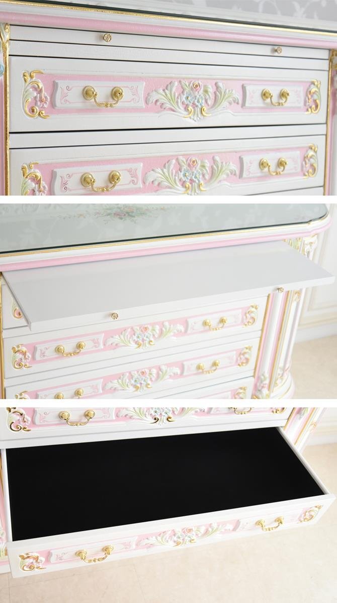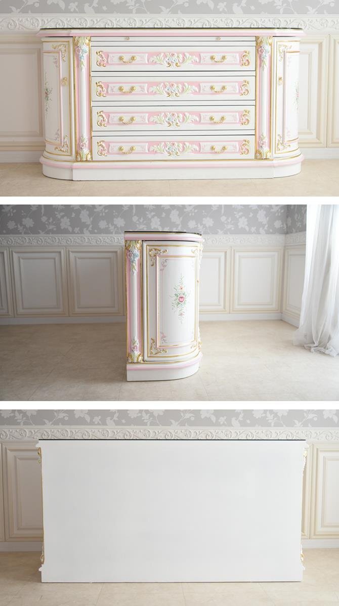 | 商品説明 | ようこそ…マリー・アントワネットの世界へ!!18世紀のヴェルサイユ宮殿を家具で疑似体験!! 『ROCOCOアントワネットシリーズ』 夢のヴェルサイユ宮殿の生活から飛び出してきたようなROCOCO調グランデチェスト…。 ゆったりと、貴族気分をお楽しみください!! 引出し4段、左右扉付き収納スペースの大容量の収納力!! なんと!!引き出すタイプの台付きなので、使い方が広がります。 引出し内部はベロア生地で、触り心地も良いです。 棚板は取り外すこともできるので、スペースを大きく使うこともできます。 ガラス天板付きなので汚れを気にせず使うことができ、汚れてもすぐに拭き取れるのでお掃除も楽ちんです。 天板のハンドペイントの美しさを保つことができます。 筆のタッチを感じるハンドペイント。まったく同じものは他に存在しません。 ハンドペイント、彫刻、装飾、ピンクやゴールドの色彩など、ROCOCO調にこだわりぬいて仕上げました。 ※イメージ写真に一緒に写っている他の家具や小物は商品に含まれません。 【サイズ(cm)約】 幅158×奥行き47×高さ85 【内寸】 台:幅90.5×奥行き最大25 引出し:幅87×奥行き36.5×高さ11 左右扉内:幅25×奥行き40×高さ68.5(上32.5/下34.5) ※棚位置変更不可(取り外しは可) 【材質】 MDF、天然木 【生産国】 中国 【備考】 ◇完成品 ※落札価格に消費税が掛かります。 ※お使いのモニターや照明器具などで、実際の色とは若干異なって見える場合があります。 ※アウトレット商品のため、多少の色ムラ、小キズが見られます。使用には問題ありません。 ※ヤフオク以外でも販売していますので、出品中に在庫が無くなった際は、出品を取り消す事がございます。 |