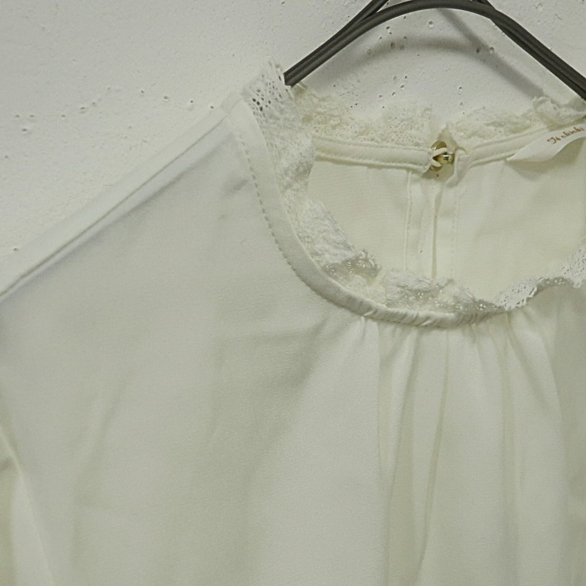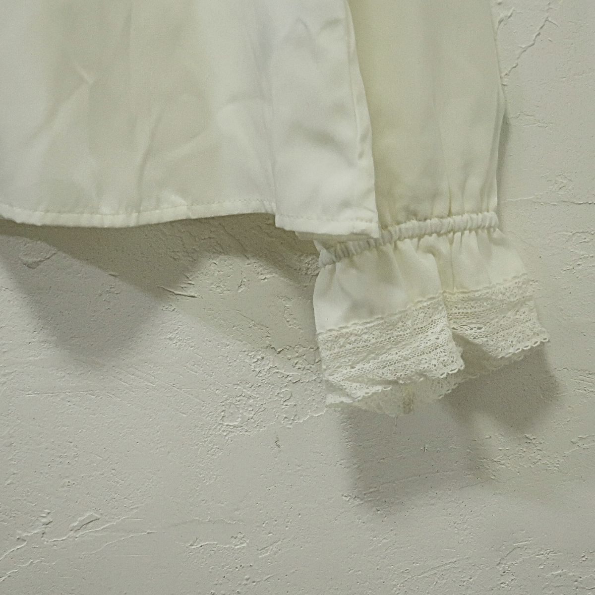 商品説明 | 【実寸約】肩幅35バスト92袖丈59着丈54 【サイズ表記】フリー 【素材ポリエステル100 】【状態】状態良好のお品物 【デザイン】オフホワイト系 スタンドネックや袖口にレース飾りがほどこされた 素敵なブラウスです |