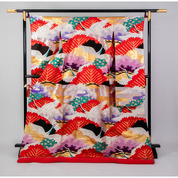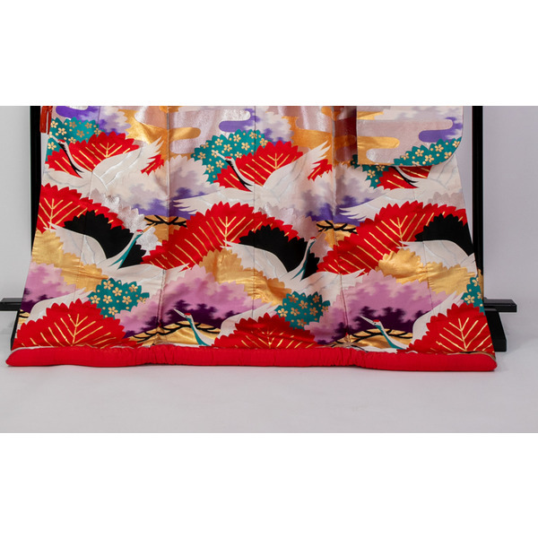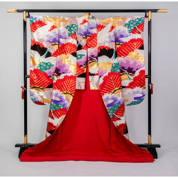 貸衣装処分品の色打掛です。 結婚式に使用できます。素材は正絹です。 寸法は袖丈104cm、裄65cm、丈178cmです。 商品のお問い合わせ、試着来店希望の人は 075-221ー5829(平日9時~18時)北川に遠慮なくお電話ください