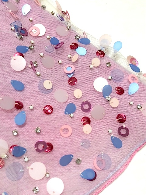 フェミニンなパープルカラーが、華やかさと上品さを演出します。動くたびにキラキラと輝くスパンコールが、夏のコーディネートを一層魅力的に彩ります。