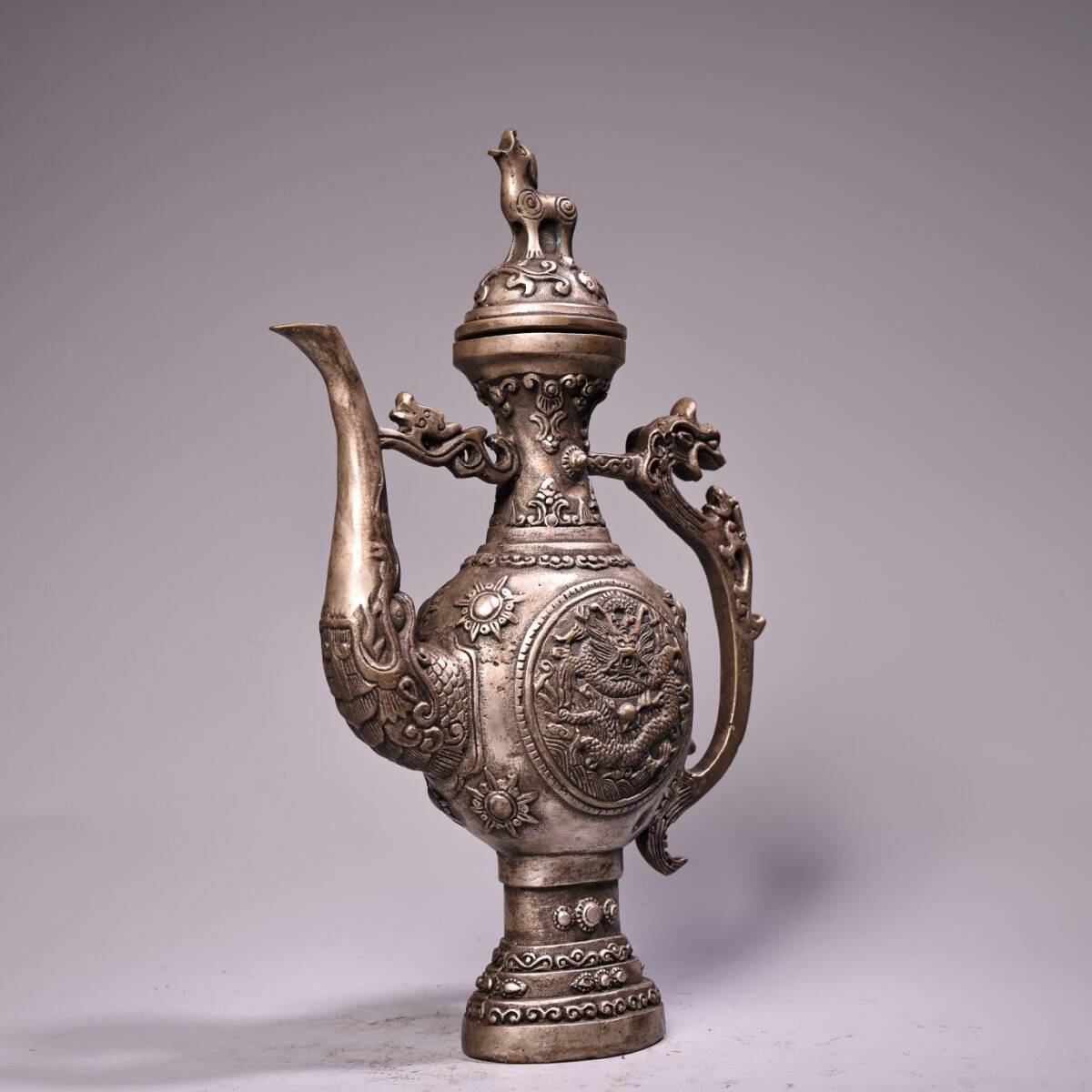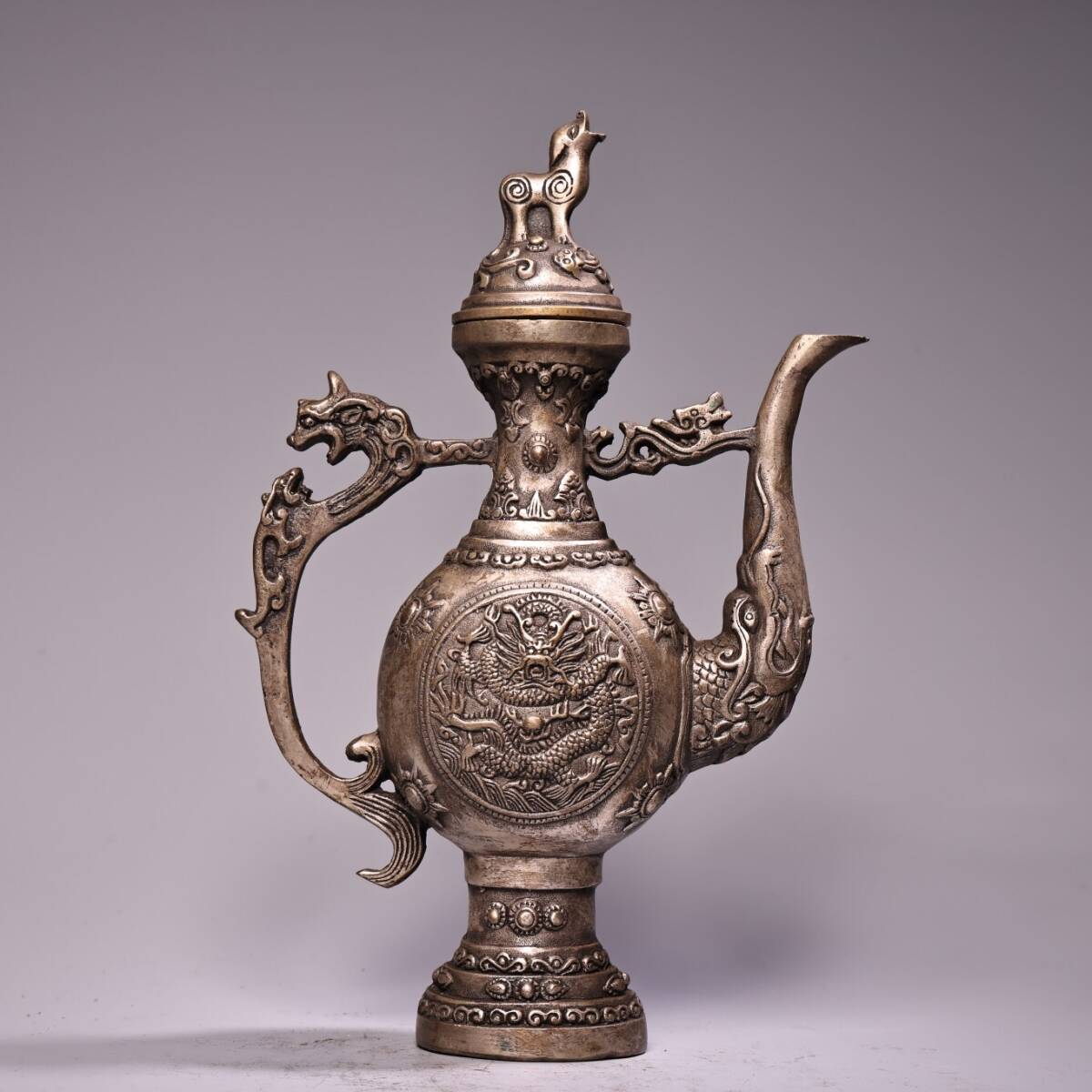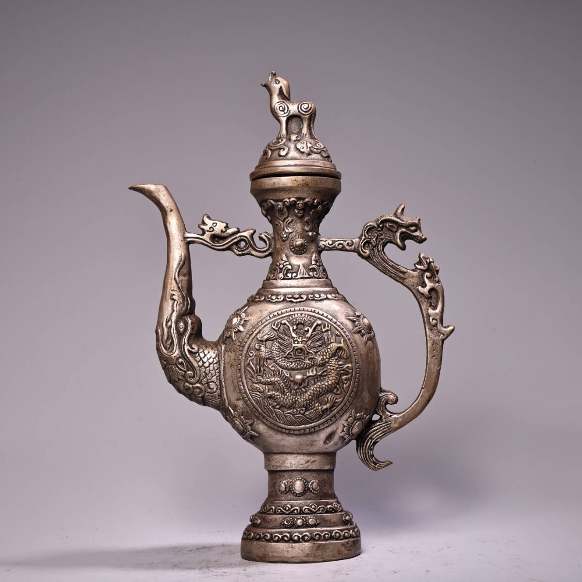 【超珍館蔵】銅製 銀鍍 龍把酒壺 置物 賞物 古賞物 古董品 古美術品 時代物 旧家蔵出 稀少珍蔵品