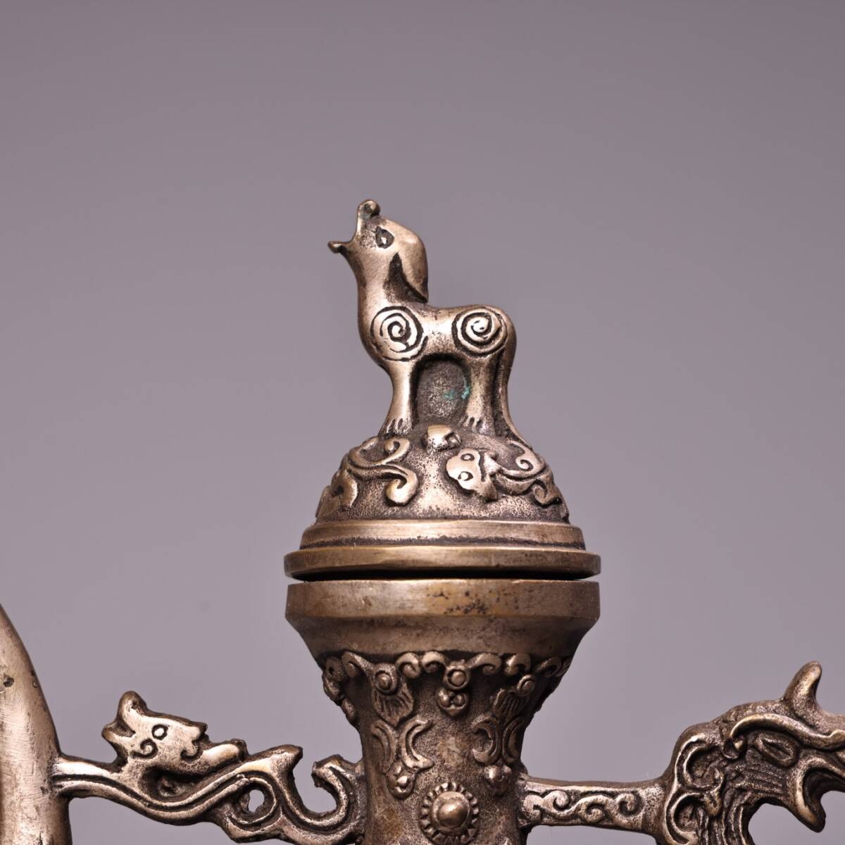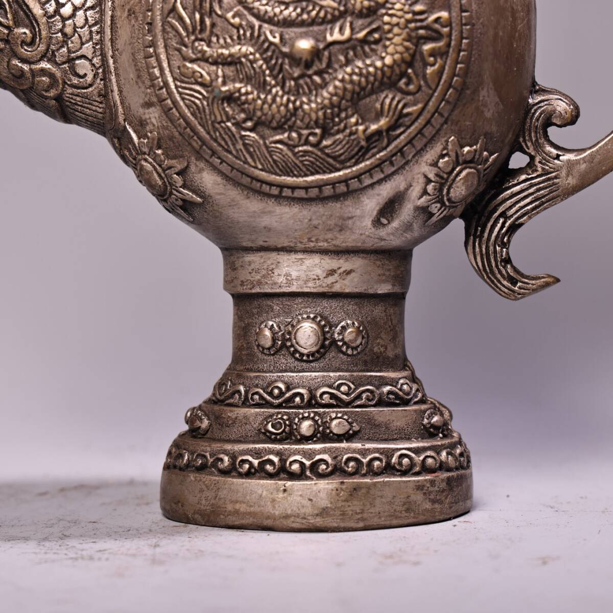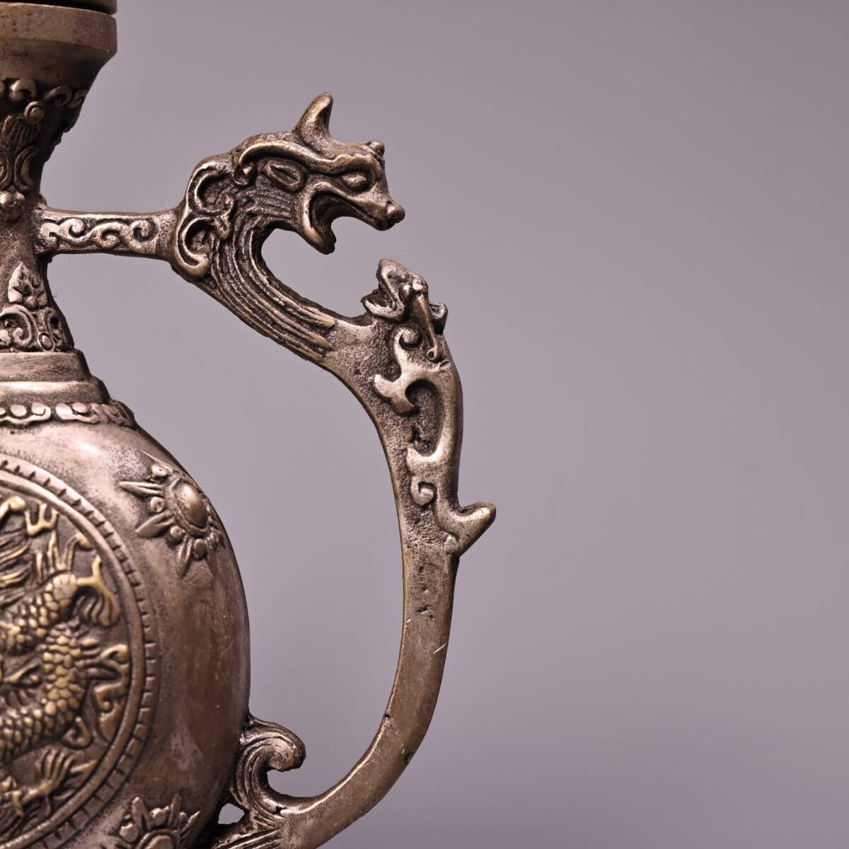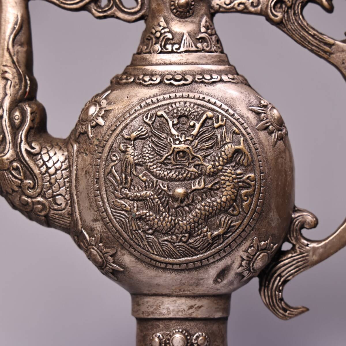 【超珍館蔵】銅製 銀鍍 龍把酒壺 置物 賞物 古賞物 古董品 古美術品 時代物 旧家蔵出 稀少珍蔵品