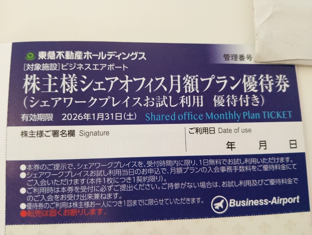 東急不動産 株主優待 ビジネスエアポート シェアオフィス月額プラン優待券 入会事務手数料半額 シェアワークスお試し利用優待付き 山手線