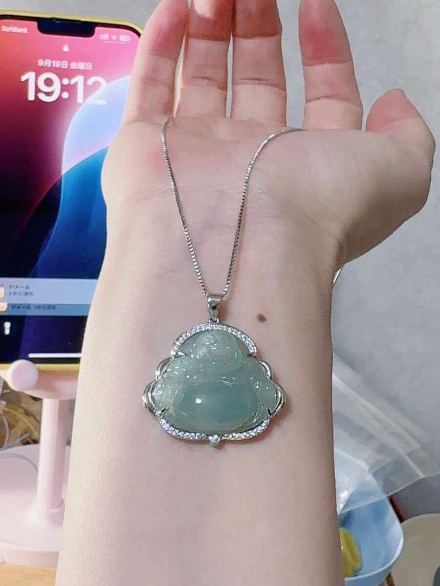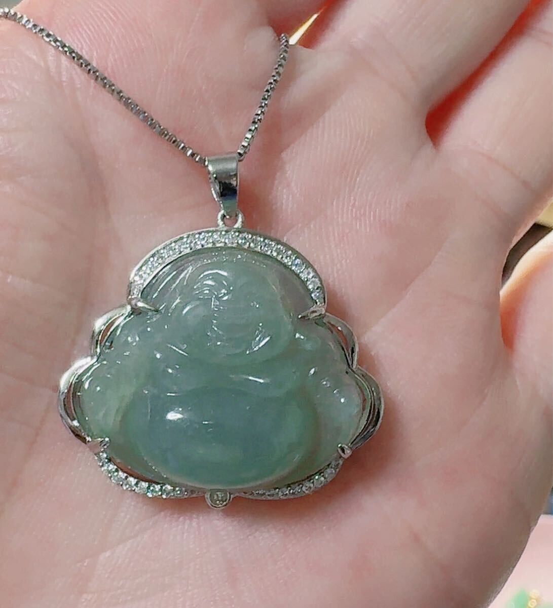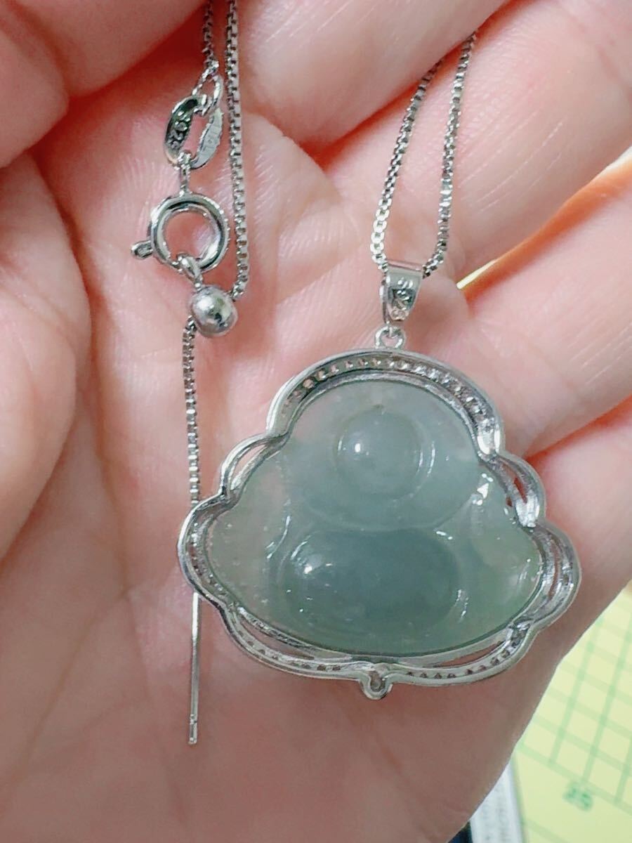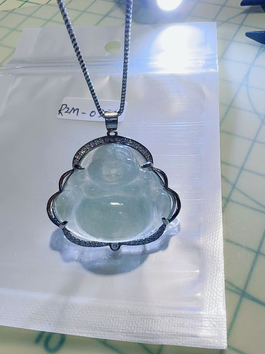 R2M-0331 天然石 《本物保証》美品 藍水翡翠 仏様ペンダント ネックレスSV925約45cm(調整可能) パワーストーン 縁起物