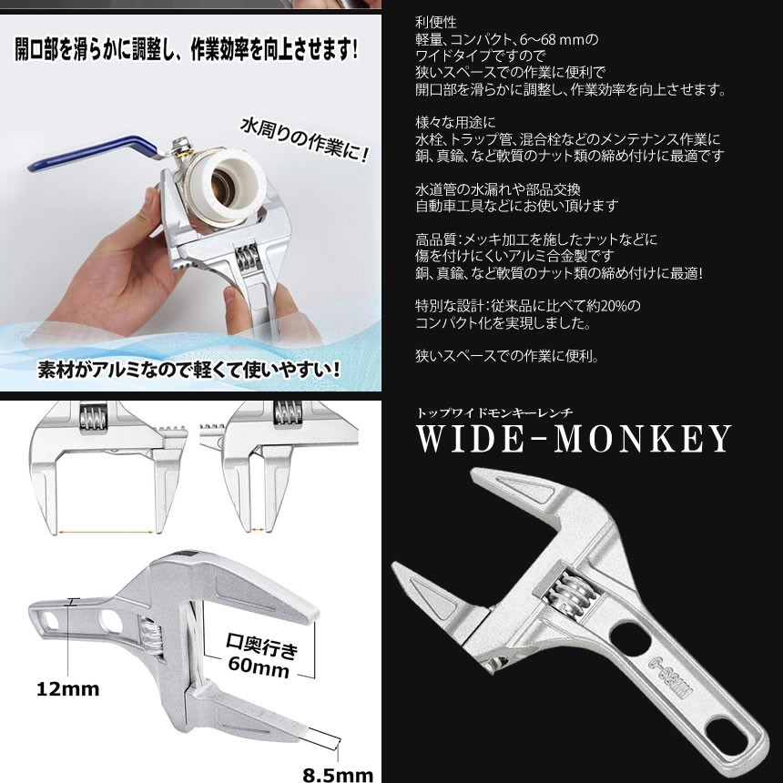 送料無料!!! 送料及び下記のご案内をご確認の上、ご入札お願い致します。 離島地域を除く九州、四国、本州まで送料無料。 ※北海道は+550円、離島地域及び沖縄県は+2500円にて承ります。(発送前に加算) ※画像内にカラー及びサイズ等の選択が可能と記載がある場合がございますが、 お届けする物はタイトルまたは商品説明文に記載の物です。 ★※注文後のカラー変更や異なるカラー・サイズ指定等は一切承っておりません。※★※仕様(ロゴデザイン/ロゴ有無等も含む)は予告なく変更する場合があります。 ※多少の汚れや小傷がある場合がございますがご了承ください。 梱包は簡易包装ですので、箱の角落ち等はご了承願います。 軽量、コンパクト、6?68 mmの ワイドタイプですので 狭いスペースでの作業に便利で 開口部を滑らかに調整し、作業効率を向上させます。 様々な用途に 水栓、トラップ管、混合栓などのメンテナンス作業に 銅、真鍮、など軟質のナット類の締め付けに最適です 水道管の水漏れや部品交換 自動車工具などにお使い頂けます ※詳細は画像をご参照くださいませ