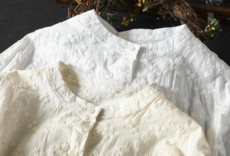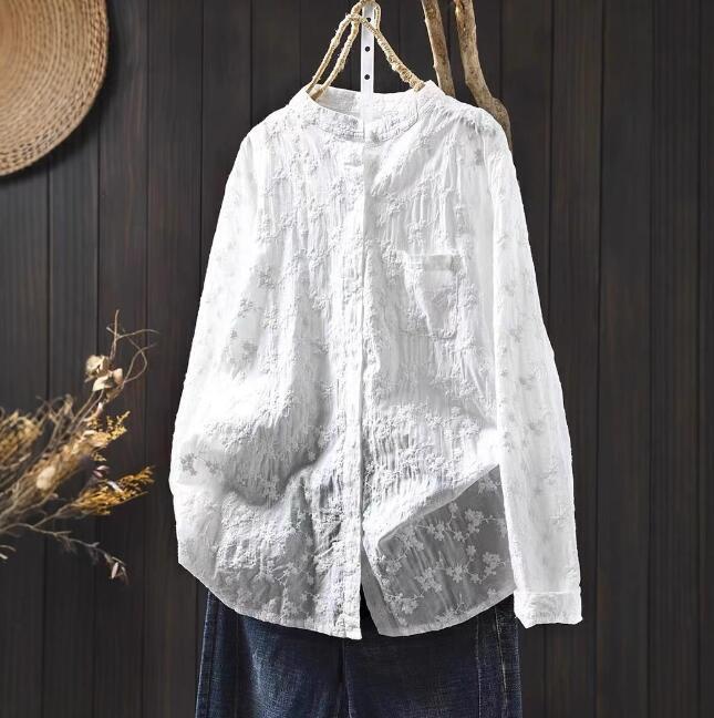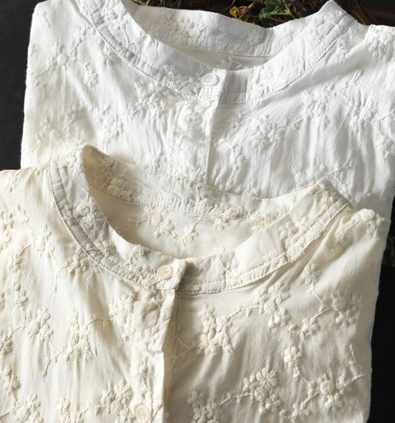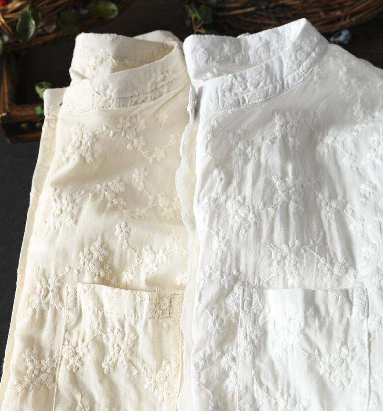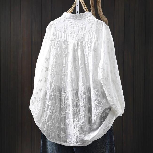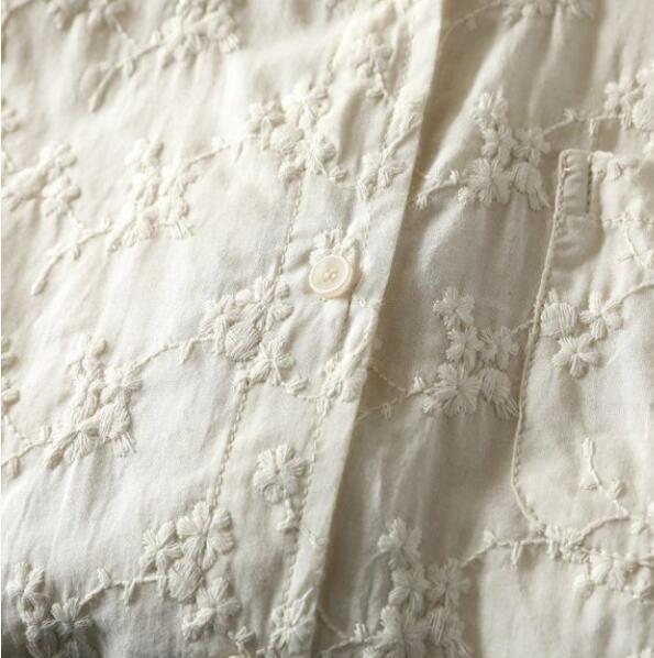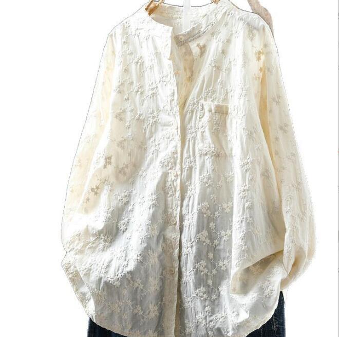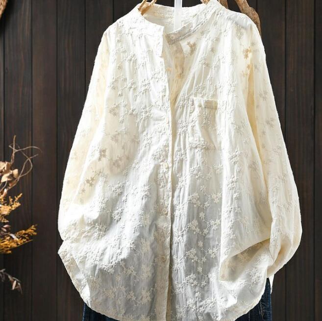 人気品ワイシャツ フリーサイズ チュニック トップス 綿100% 全刺花柄 ナチュラル 通気性肌触り抜群 オフホワイト