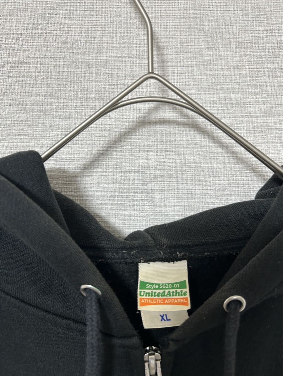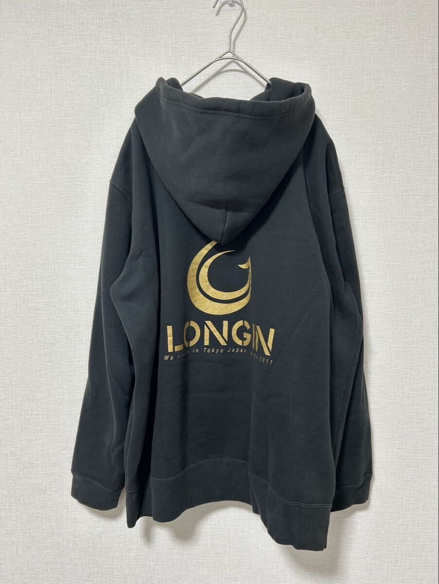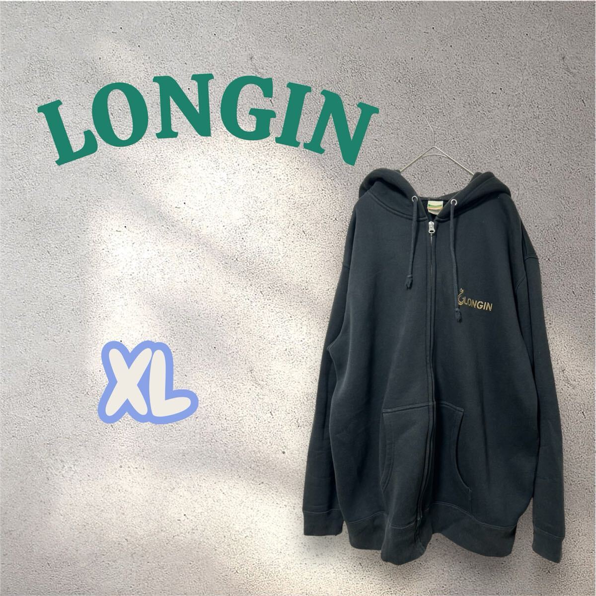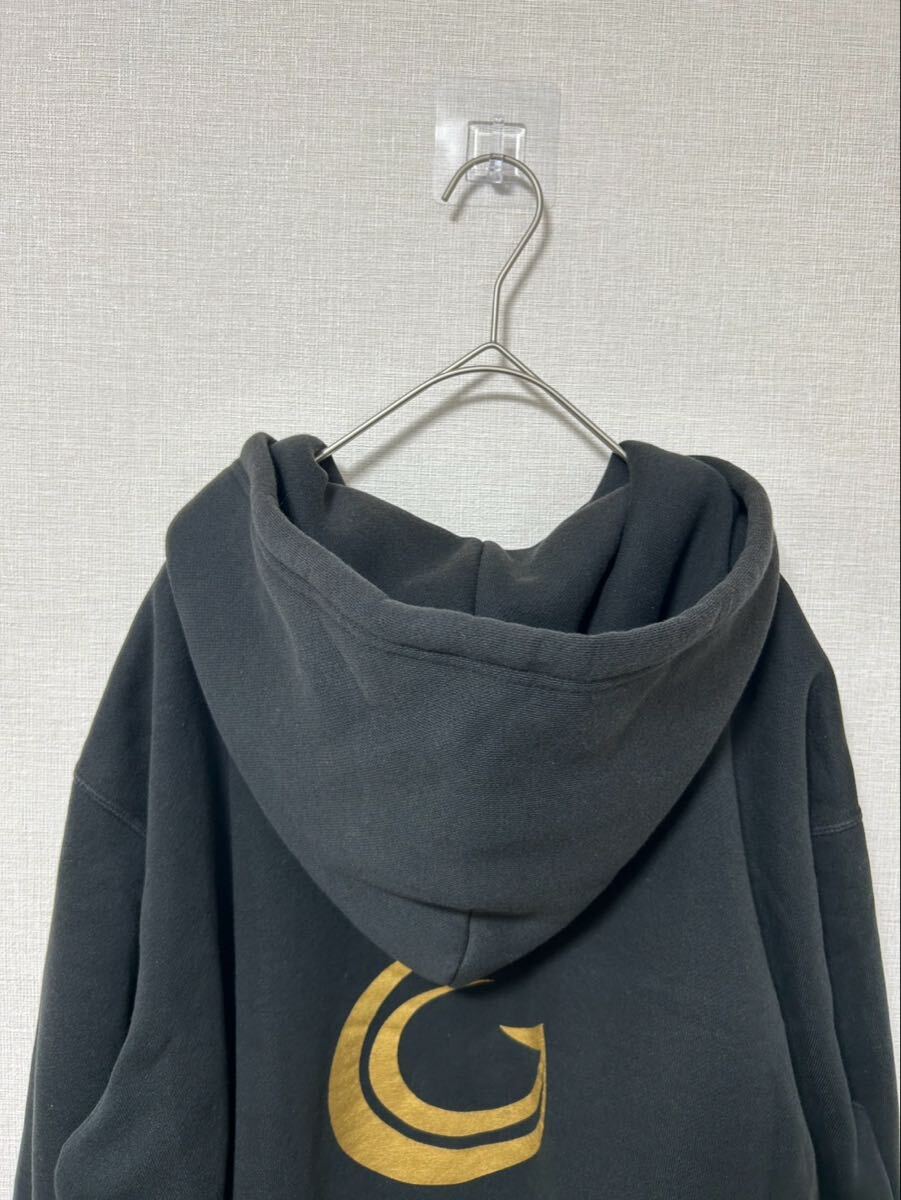 フロントジッパーのフード付きパーカー、XLサイズ、ゴールドロゴが特徴。