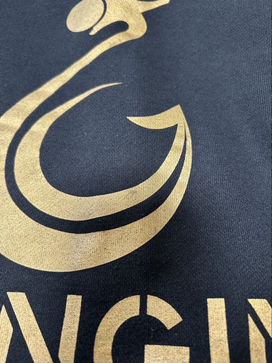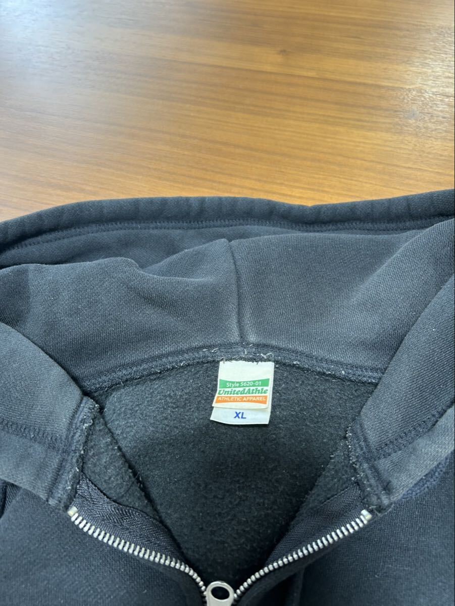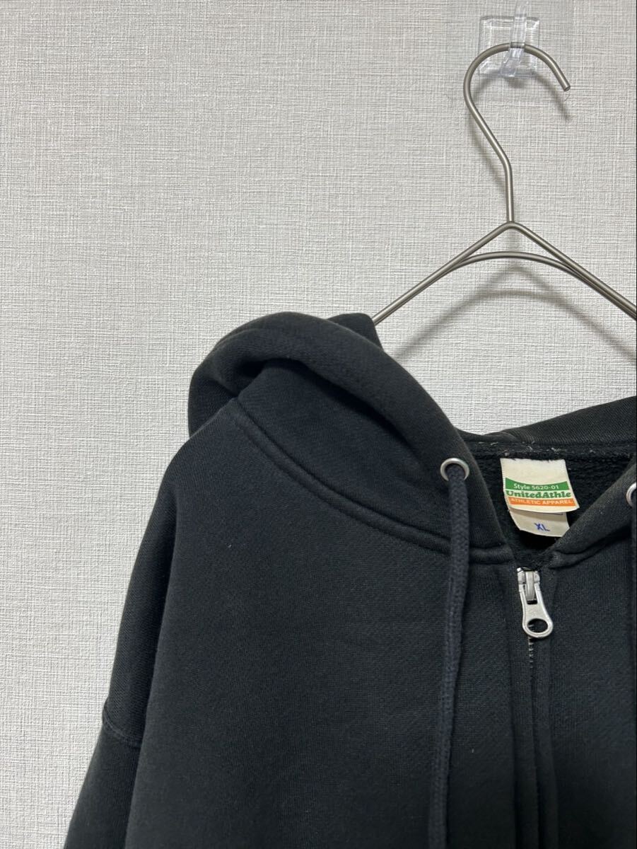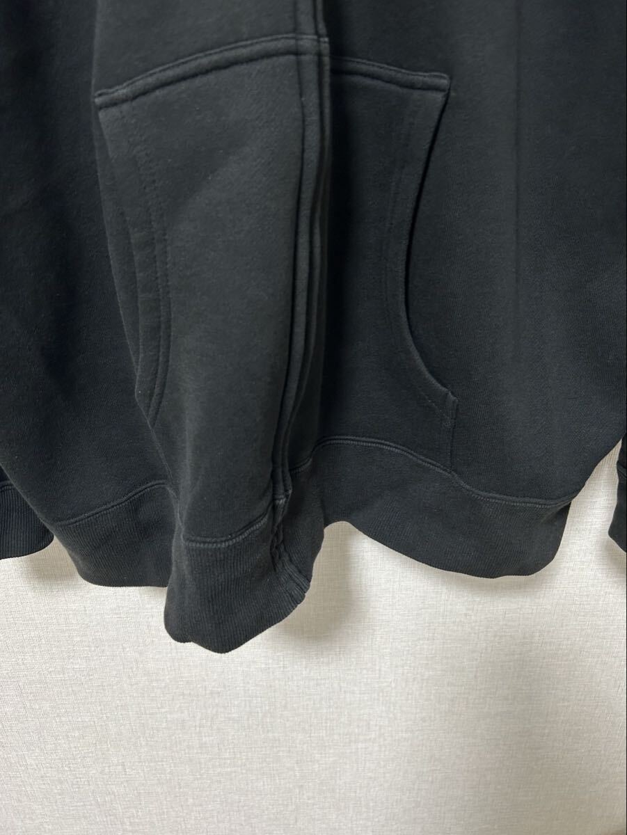 フロントジッパーのフード付きパーカー、XLサイズ、ゴールドロゴが特徴。