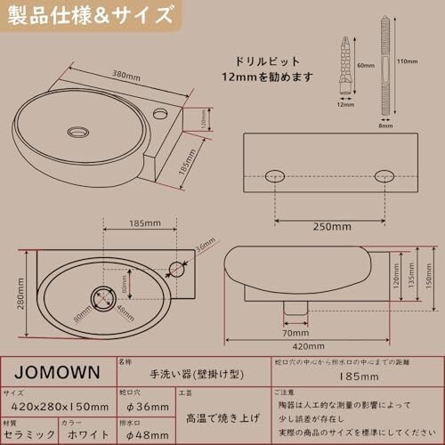 ♥【規格&取り付け説明】:小型洗面ボウルのサイズ:425*285*150mm、重さ:8kg、排水口径:48mm。蛇口の取り付け穴径:36mm、取り付けホースの規格:G1/2ナッツ(φ21mm)、ドリルビットは12㎜を勧めます。 この洗面シンクはホテル、家、会社、ビル、キッチン、浴室、トイレなどに適用します。洗面ボウルと排水金具は設置が簡単なので、取扱説明書どおりに設置すればでいいです。おしゃれなデザインを与えています。