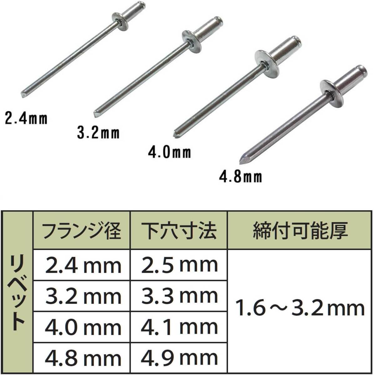 2.4mm・3.2mm・4.0mm・4.8mmの4サイズのアルミ製ブラインドリベットに適応しています。