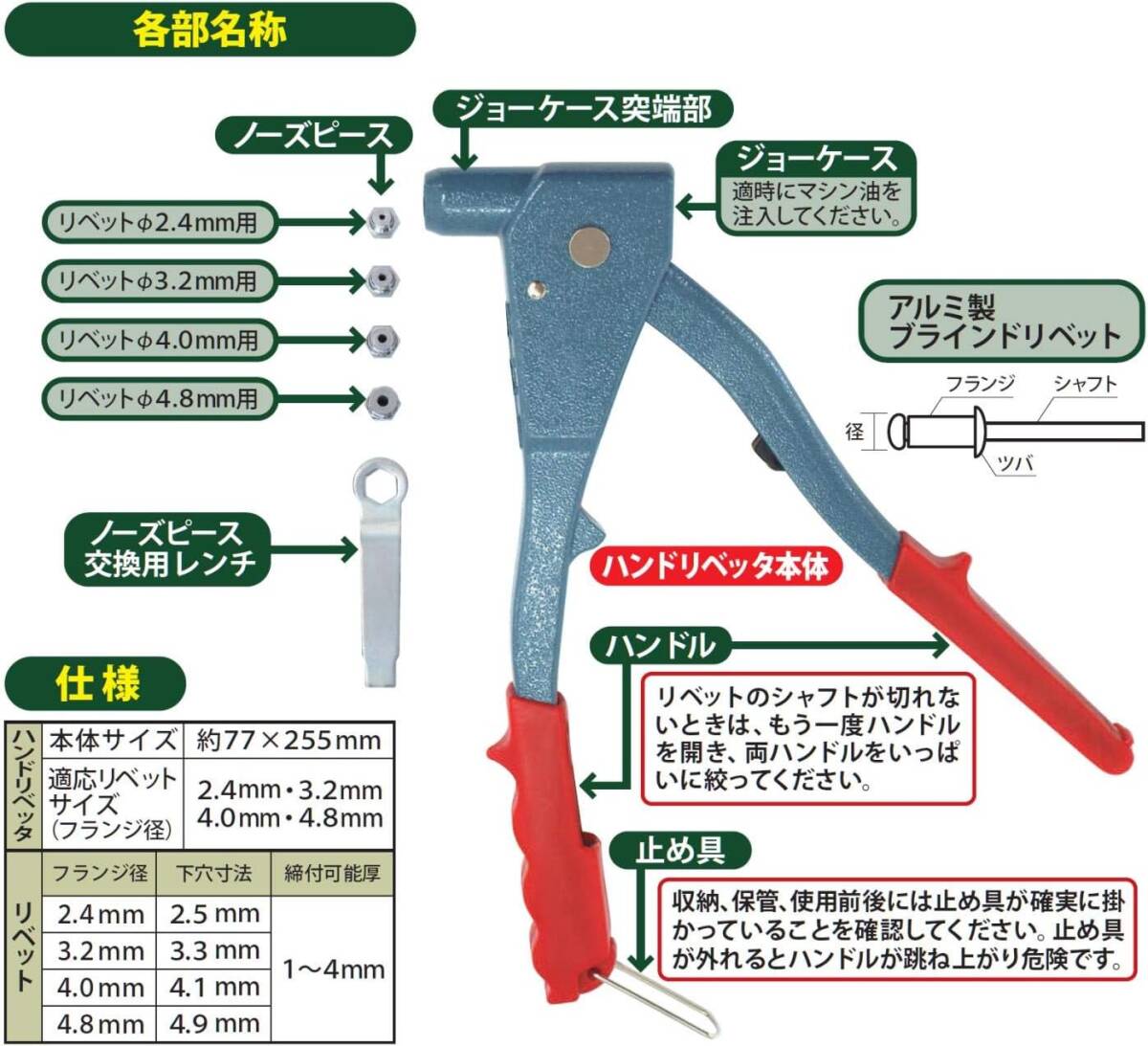 • セット内容:ハンドリベッタ本体/1個、ノーズピース(2.4mm、3.2mm、4.0mm、4.8mm用)各1個、アルミ製ブラインドリベット(2.4mm、3.2mm、4.0mm、4.8mm)各15本、ノーズピース交換用レンチ/1個