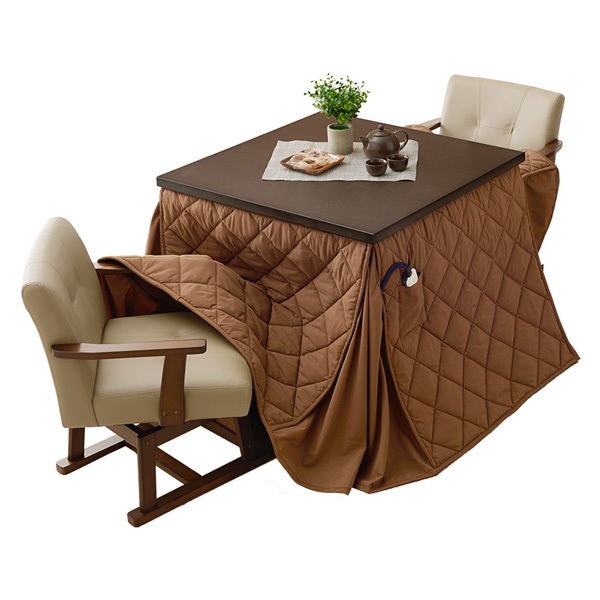 ハイタイプダイニング高脚こたつセット コタツ+椅子2脚+掛け布団(マロン) こたつ(KOT-7311DBR-80) 80×80センチ 正方形 ダークブラウン色80×80センチ巾の落ち着いた家具調ハイタイプこたつテーブルに椅子2脚に掛け布団までセットしました。寒い冬は天板と本体の間にふとんをはさんでハイタイプコタツとして、春夏秋は布団を取り外して天板を固定し、ダイニングセットやデスクにと年中お使いいただけます。イスは回転式ですので、立ち座りが楽にできます。ヒーターは薄型ですからテーブルとして使用時にヒーターは外からは見えません。□こたつテーブル■サイズ:幅80×奥行80×高さ45/50/55/60/65/70センチ■天板:オーク突板 UV硬質ウレタン樹脂塗装●600Wハロゲンヒーター(手元コントローラー付:MHU-601E(D) □回転椅子(KC-7589)■サイズ:幅56×奥行54×高さ73.5/68.5×座面高さ40.5/35.5センチ■素材:ラバーウッド 張り生地:合成皮革□掛け布団(マロン)■サイズ約:幅80×奥行80×高さ73■表生地:ポリエステル(ピーチスキン)■裏生地、スリット:ポリエステル(東レ マッシュロン使用)■中綿:ポリエステル(ピーチスキン)☆落札、ご入金確認後 1~2日にて発送いたします 追加納期のかかるものは商品ページに記載いたしております よろしくお願いいたします。