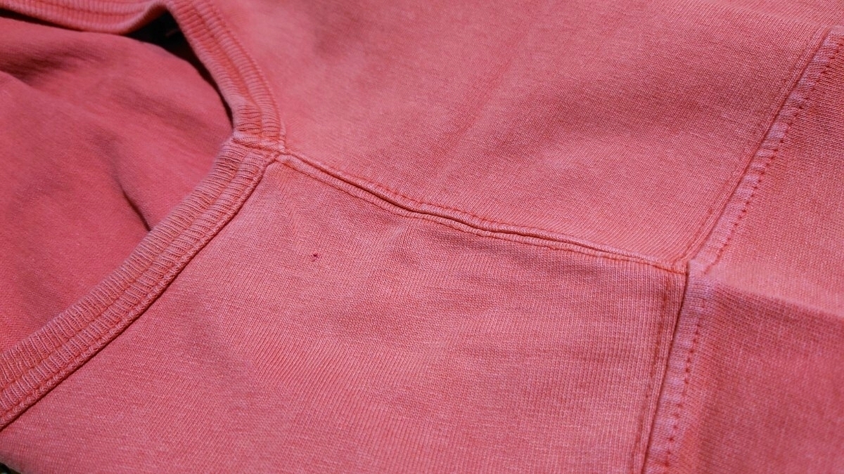 目立つダメージや汚れはありませんが、着用による色褪せ色落ちがあり、左首横と左胸辺りにピンホールがあります。