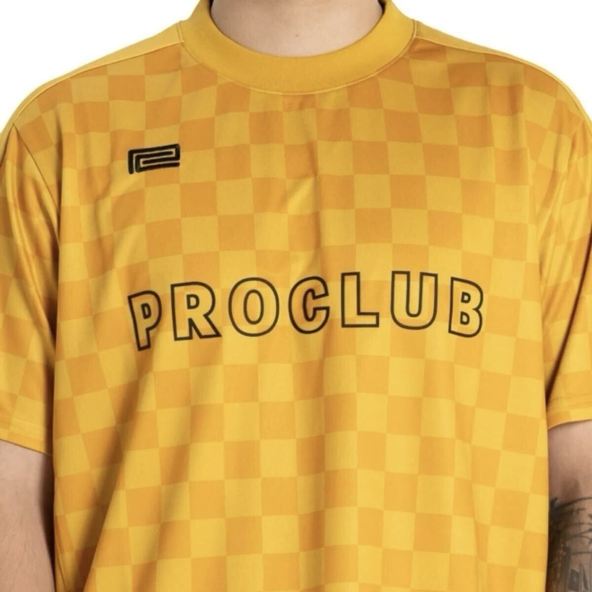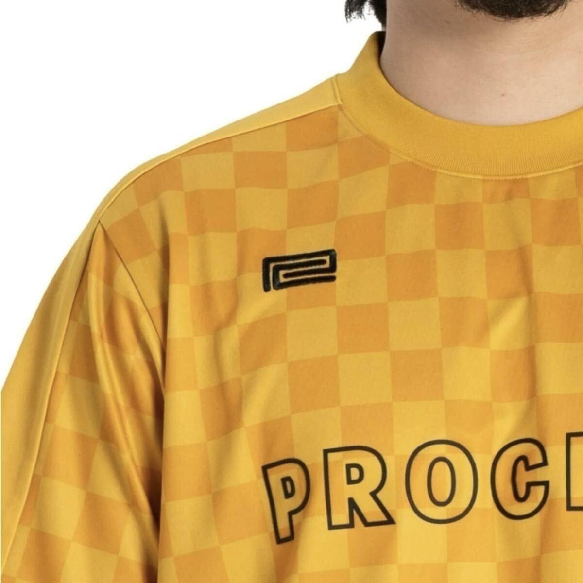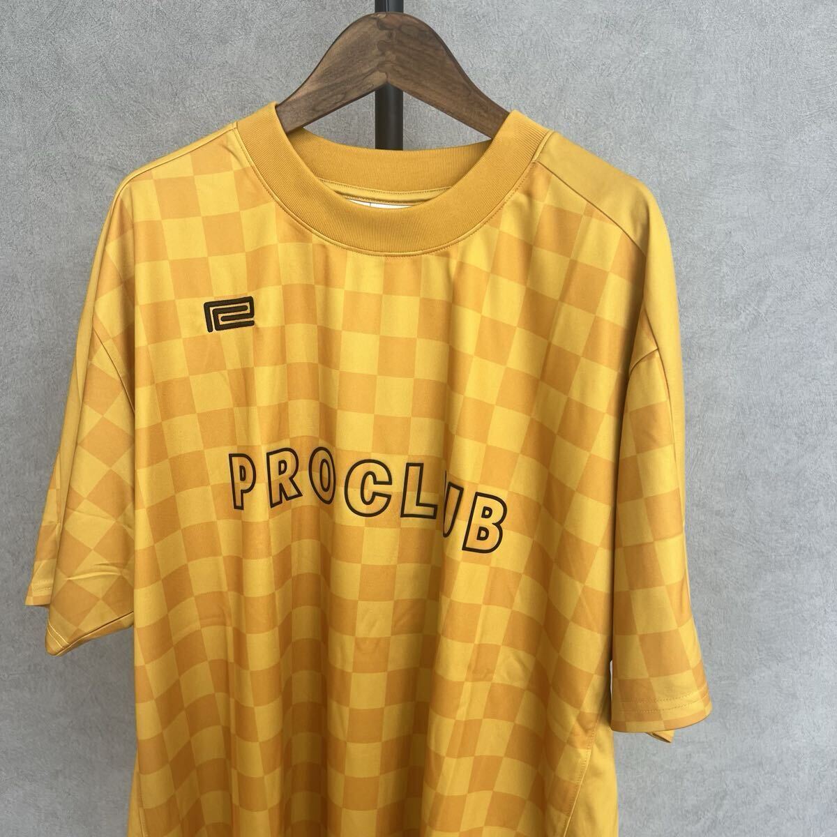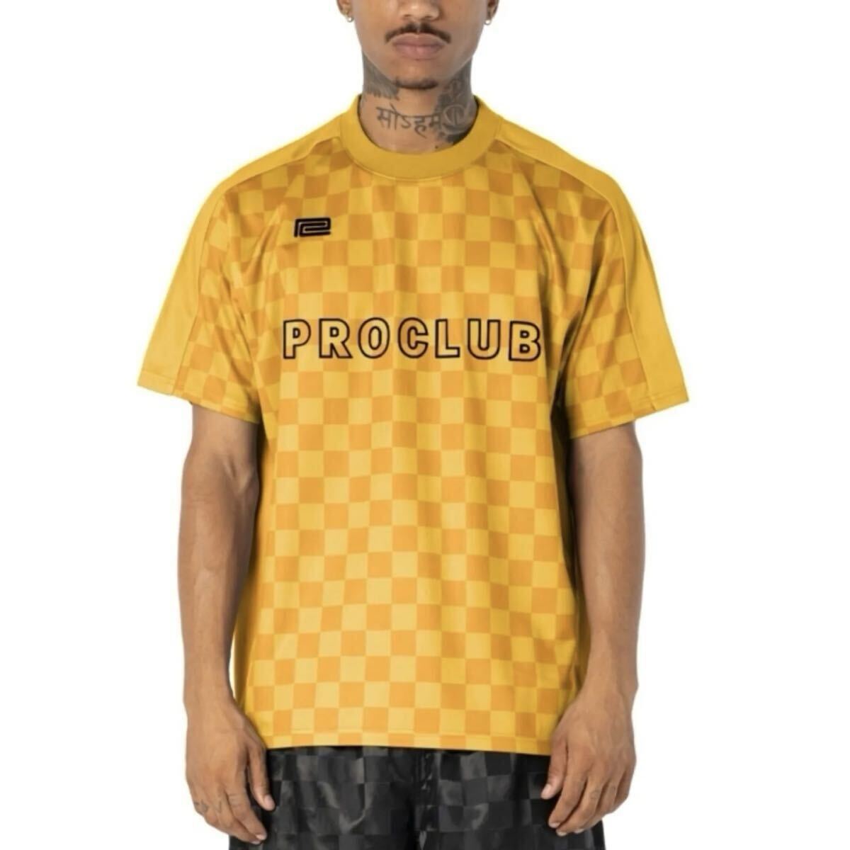 チェック柄と通気性のあるポリエステルを使用したパフォーマンスサッカージャージ。