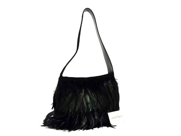 1円 ■美品■ Salvatore Ferragamo フェラガモ ダブルガンチーニ フェザー×スエード ワンショルダーバッグ 肩掛け ブラック系 GA5250