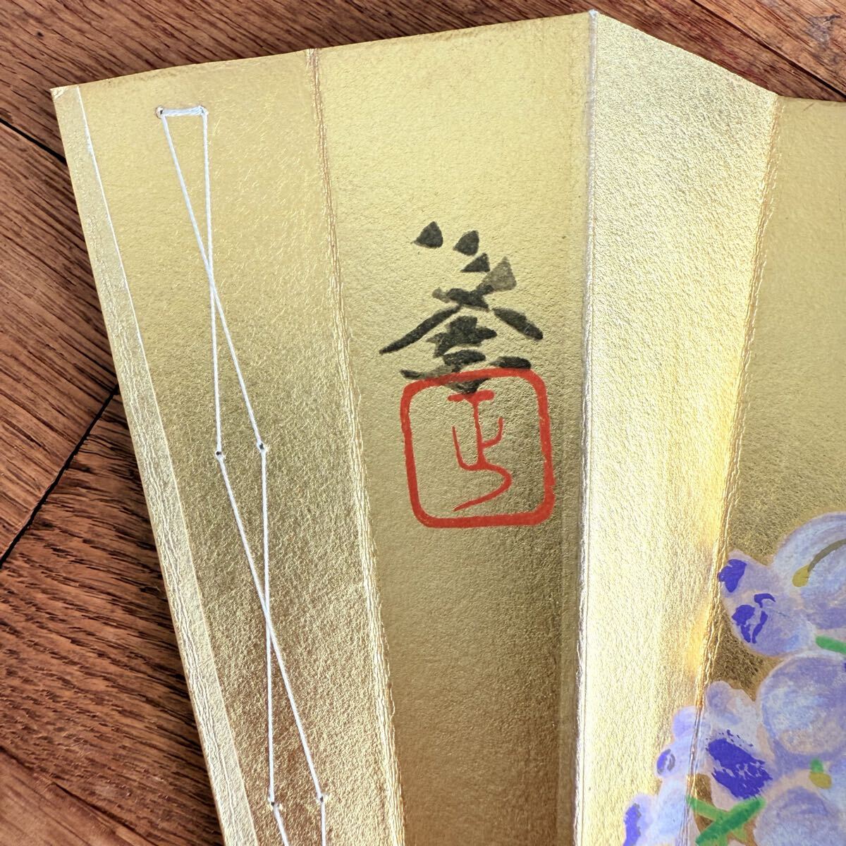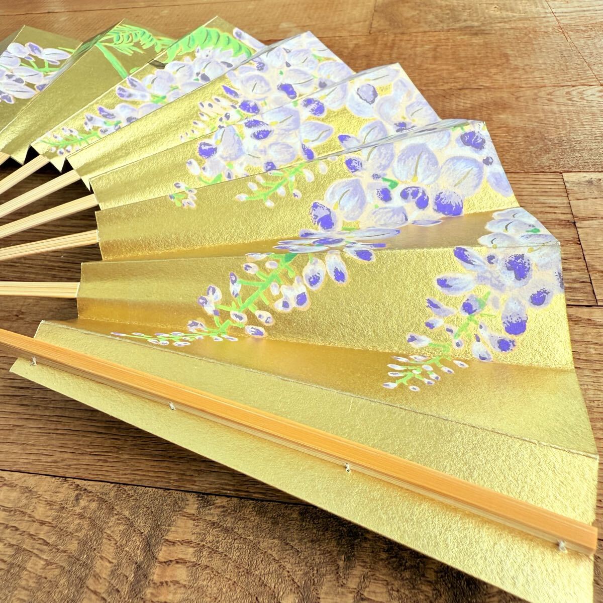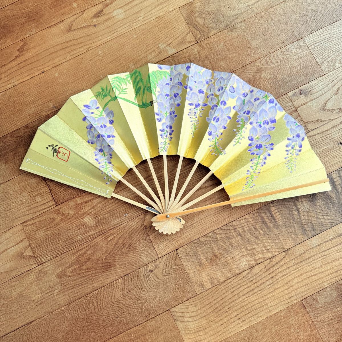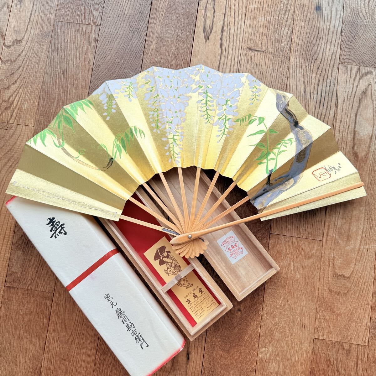 京扇堂 扇子 飾り扇 未使用 金地 藤の花 日本舞踊 伝統工芸 京都製 工芸品 和雑貨 和室飾り 芸術品 日本土産 木箱付き 美品 インテリア コレクション 文化財風 贈答用