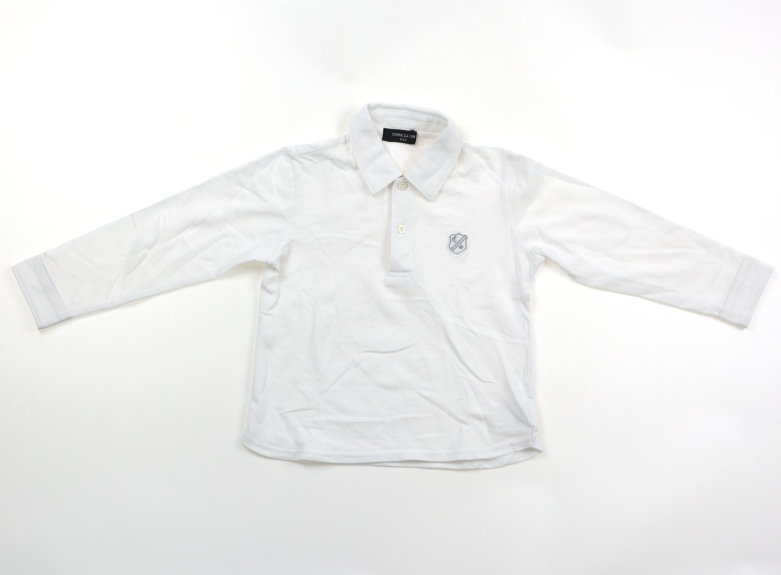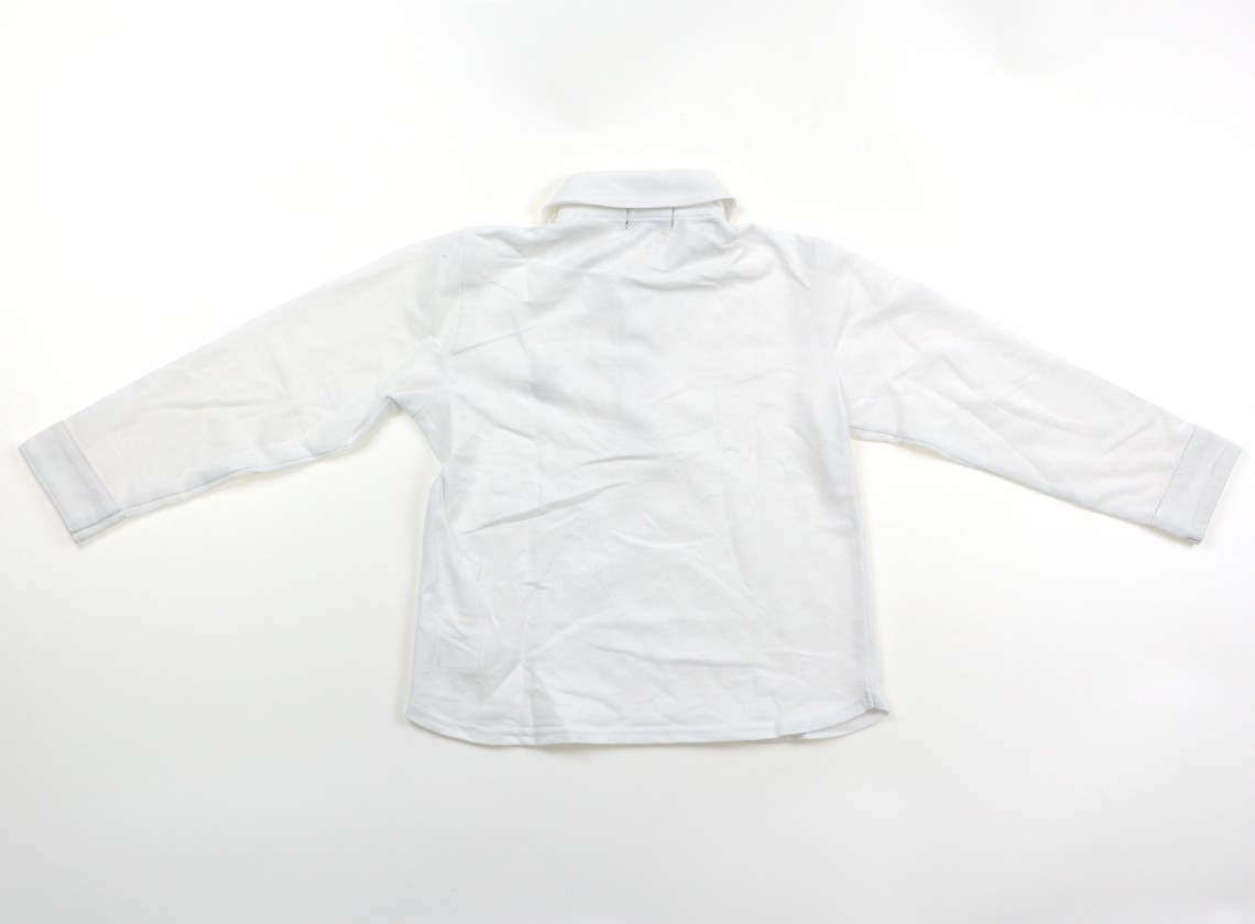 綿、ポリエステルの鹿の子カットソー生地。シワがありますが、目立つ汚れはありません。後ろ中心着丈、約39cmです。衿裏にネクタイ取り付けボタンがありますが、ネクタイはありません。