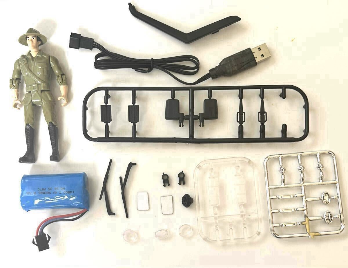 コレクターの放出品です。未使用品と思われますが断定はできません。黒のランナーの一番端の部品が外れて紛失していますが、説明書を見ますと必要なのは2個ですので問題ないと思います。送信機のみ通電を確認しました。問題はありません。写真が全てです。写真をよく見てご検討ください。