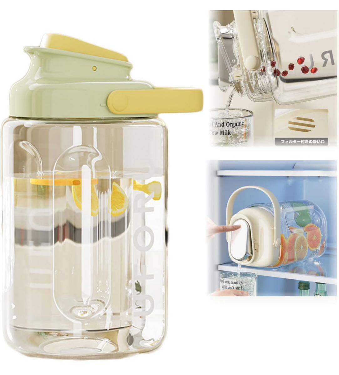 【9cmの大口径フィルター付き注ぎ口デザイン】9cmの大口径フィルター付き注ぎ口デザインにより、冷蔵庫から直接水を取り出すことができ、水を注ぐ手間を省けます。注ぎ口にはフィルターノズルが付いており、残留物がなく安心して飲めます。9cmの大口径により、底部までしっかりと洗浄でき、果物の残留物を防ぎます。毎日安心で健康な飲み物を楽しむことができます。