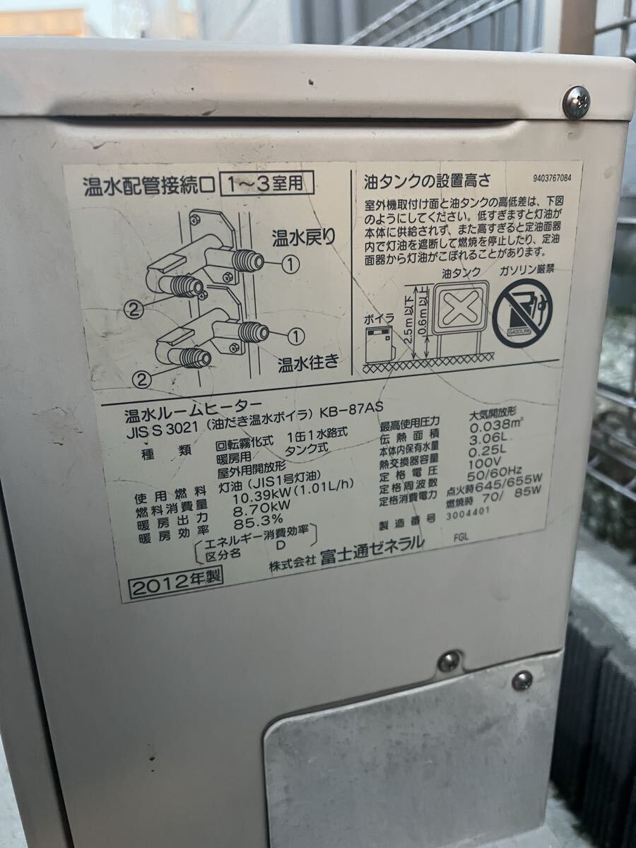 富士通 KB-87AS 温水ルームヒーター油だき温水ボイラ 室外機 2012年製 現状品