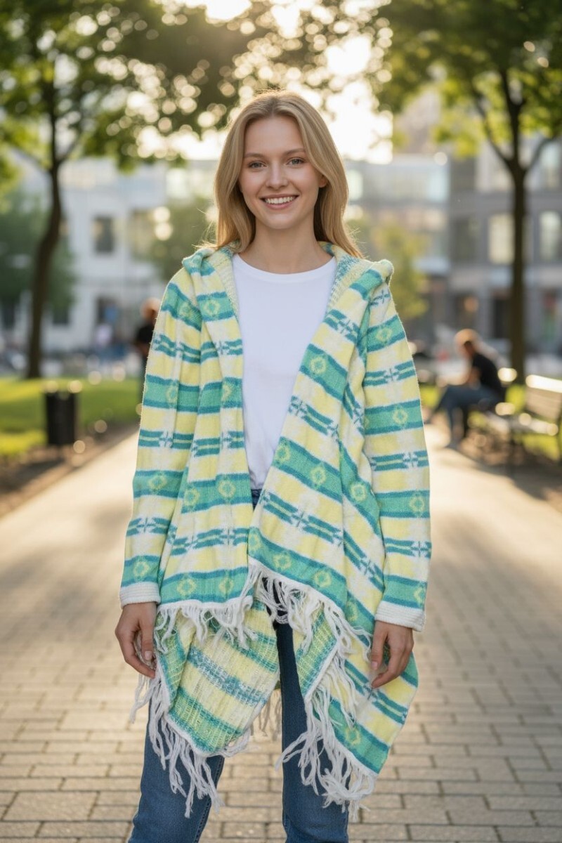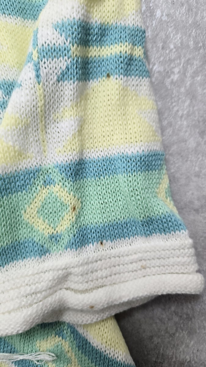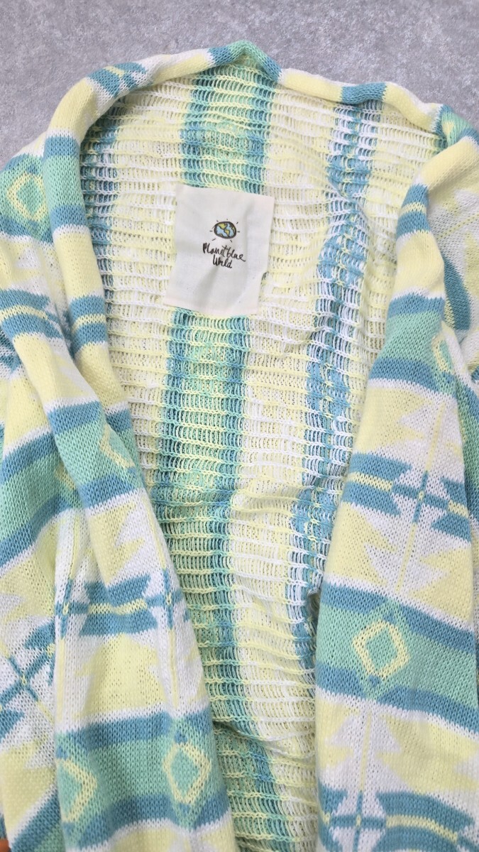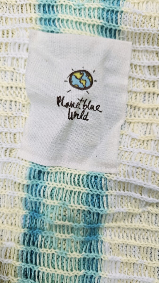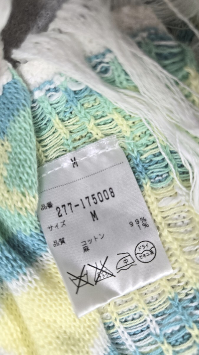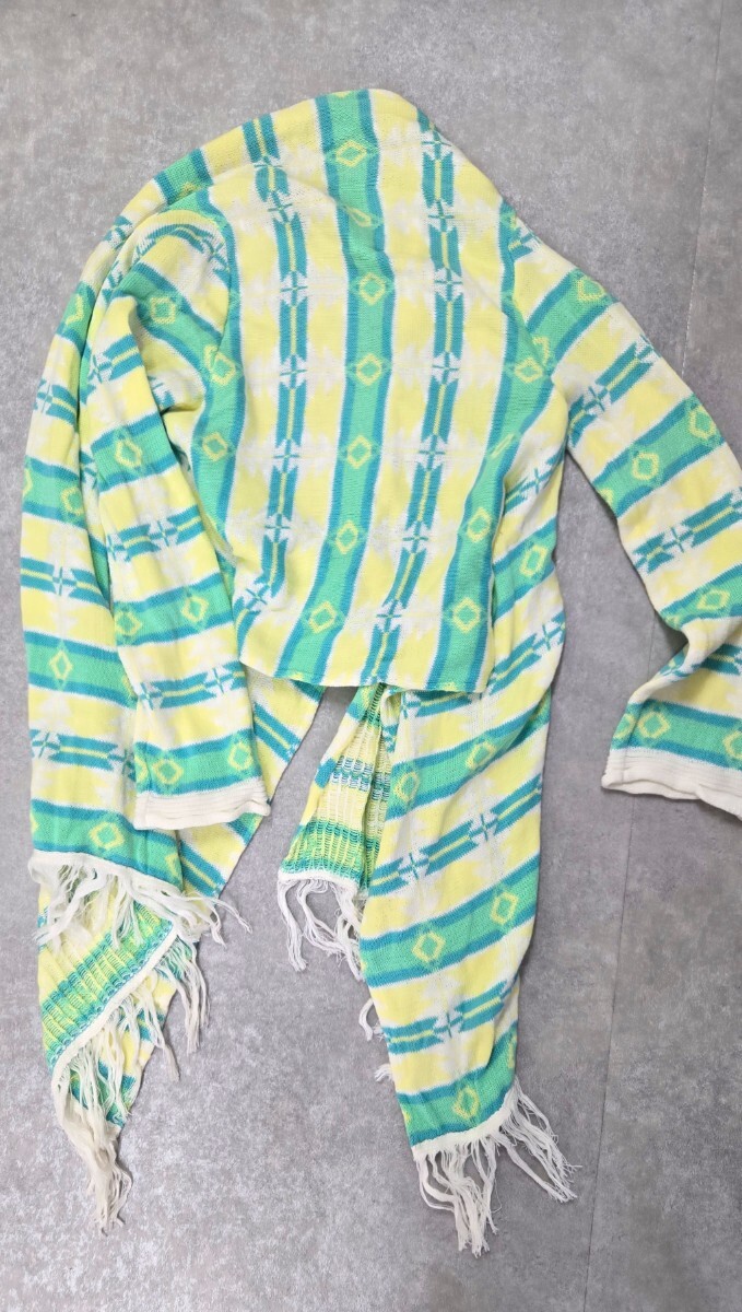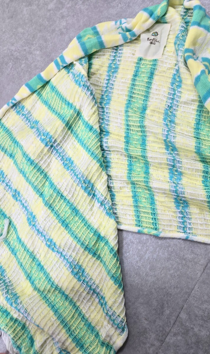 プラネットブルーの軽量で通気性の良い、イエローとグリーンのカラフルなストライプデザインのストールガウンです☆