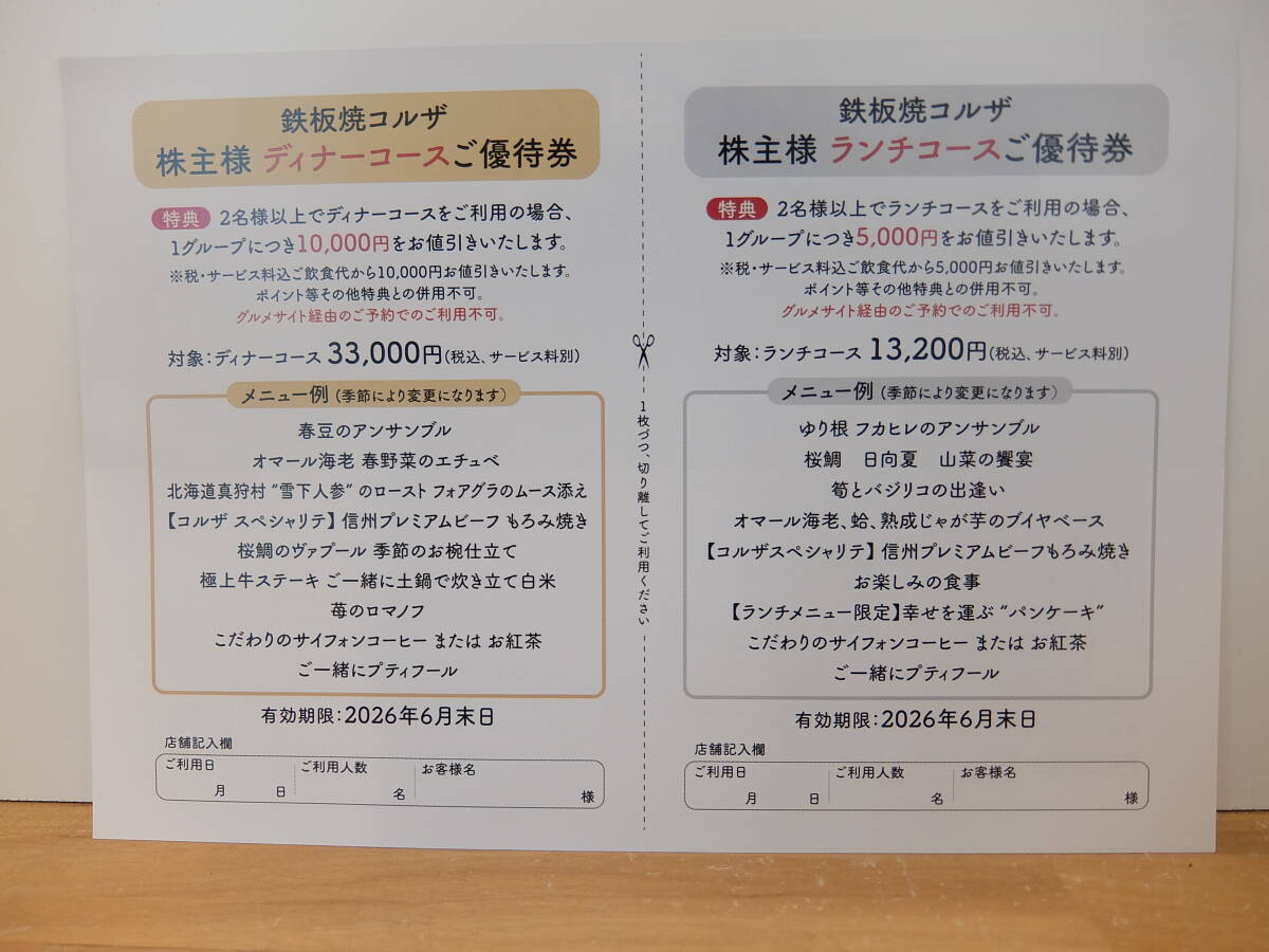 鉄板焼コルザ優待券 キッコーマン株主優待 の出品です。