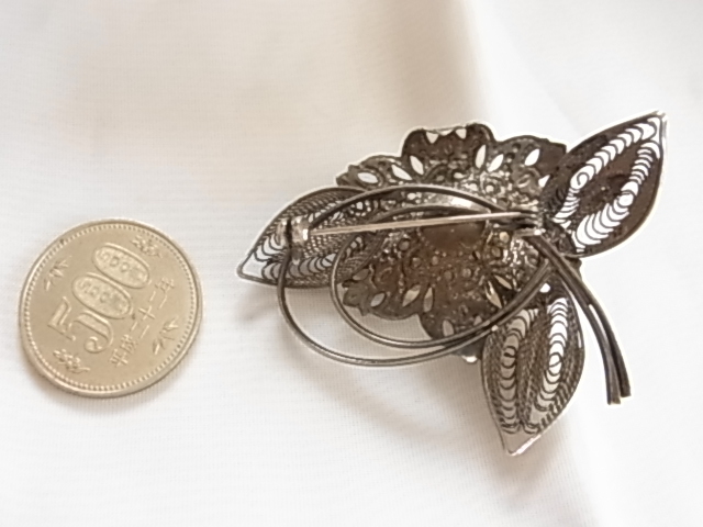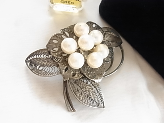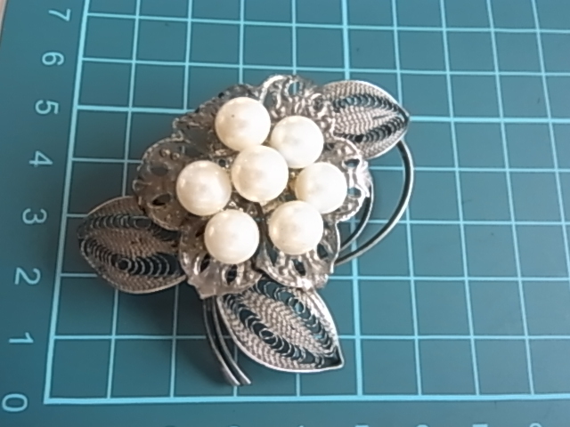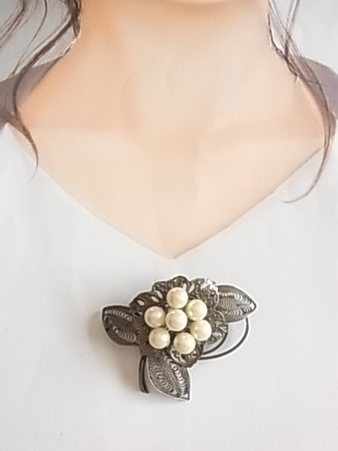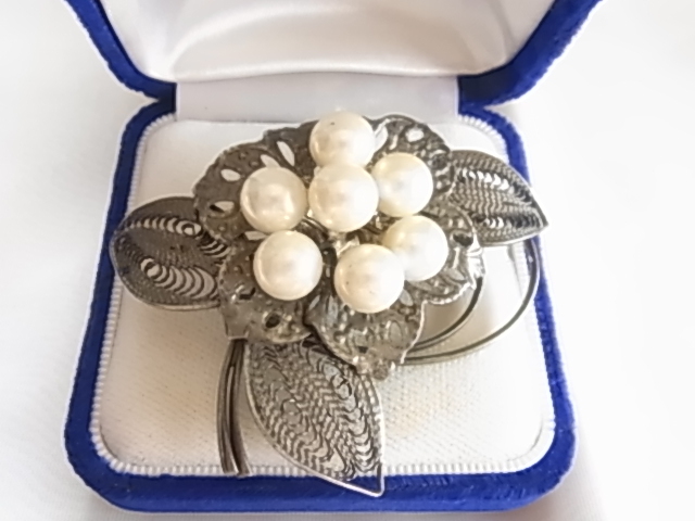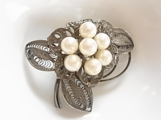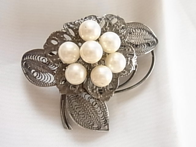 ビンテージ/ヴィンテージ シルバートーン 銀色トーン 品質不明のパールストーン お花デザイン フラワー 昭和レトロの素敵ブローチ※