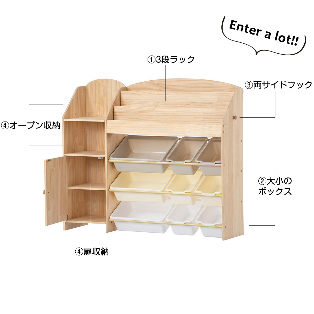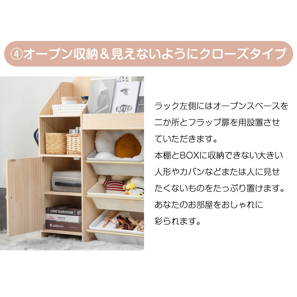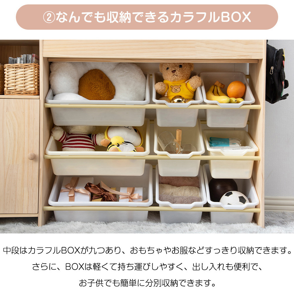 • point3.【収納力抜群でお部屋すっきり】 1.しっかり置ける3段ラック 2.なんでも収納できるカラフルBOX 3.サイドスペースも有効利用 4.オープン収納&見えないようにクローズタイプ