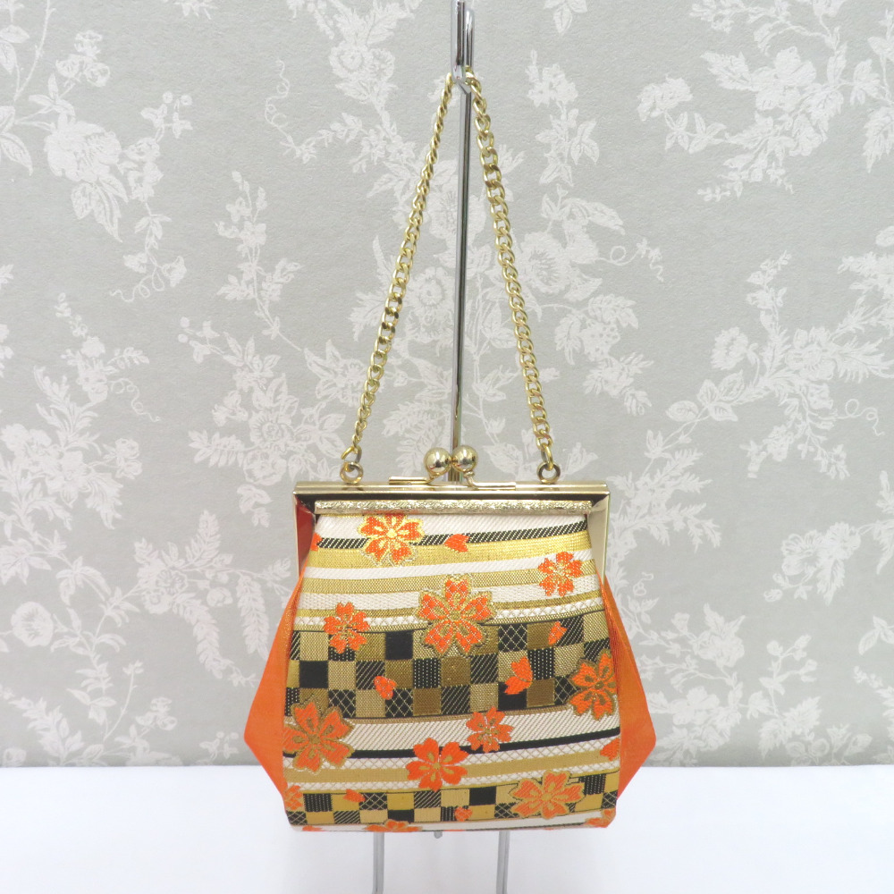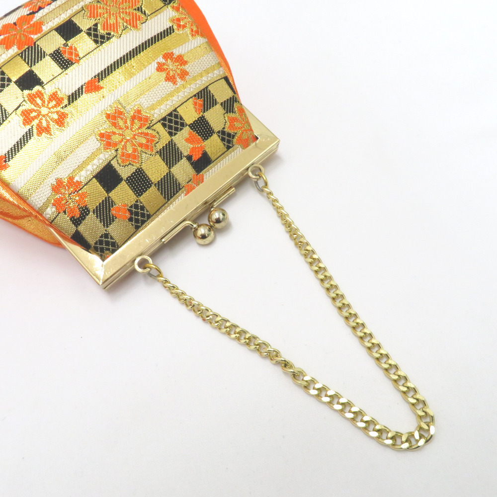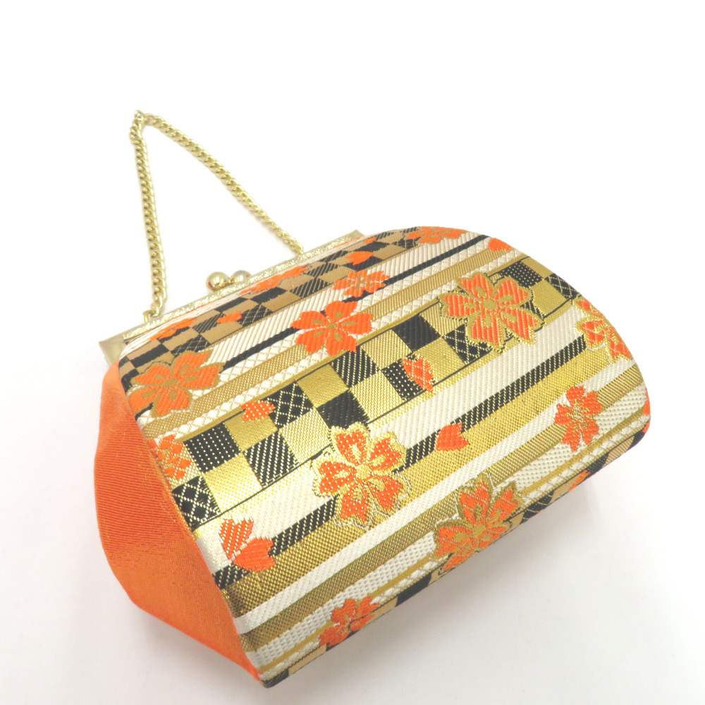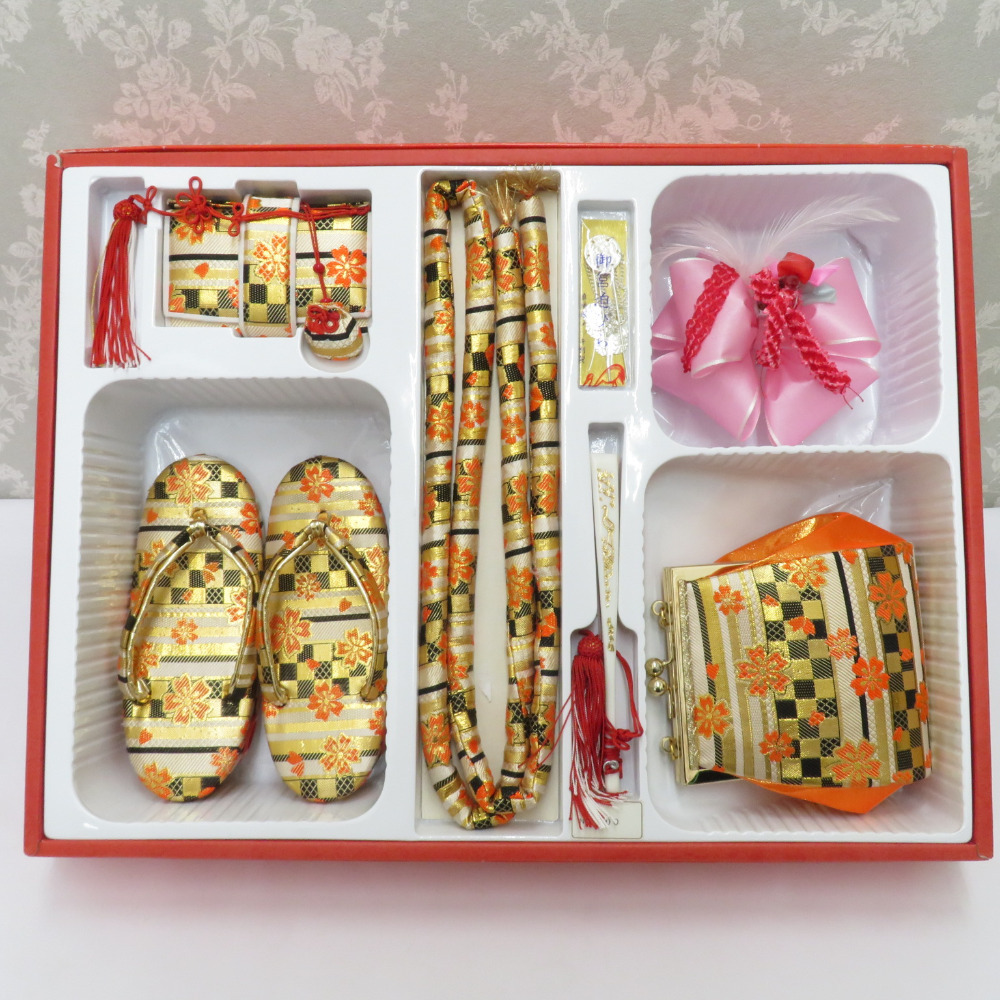 | 子供着物 女児 筥迫セット 7点セット オレンジ×白×黒×金 桜 市松 横段 女の子 七五三 はこせこ キッズ ハコセコ |