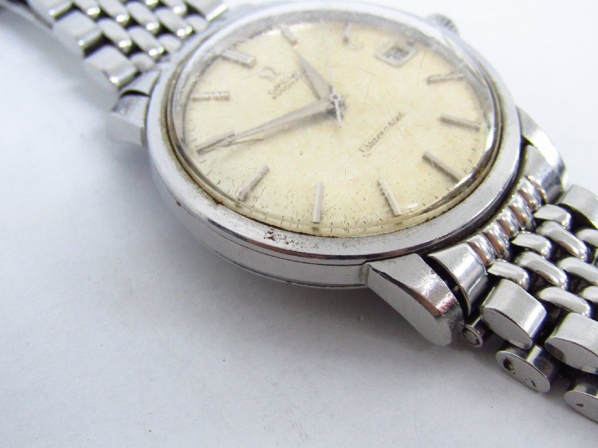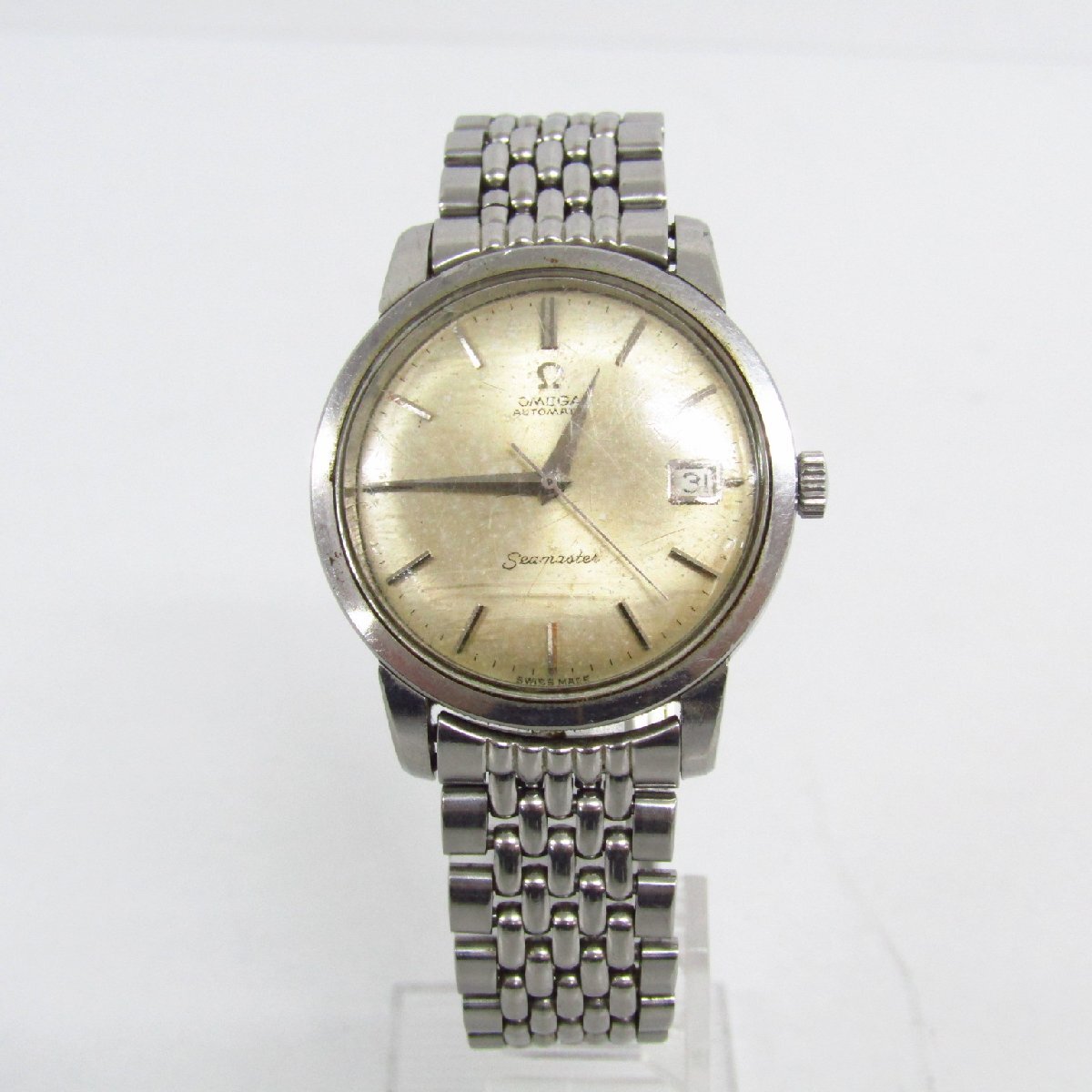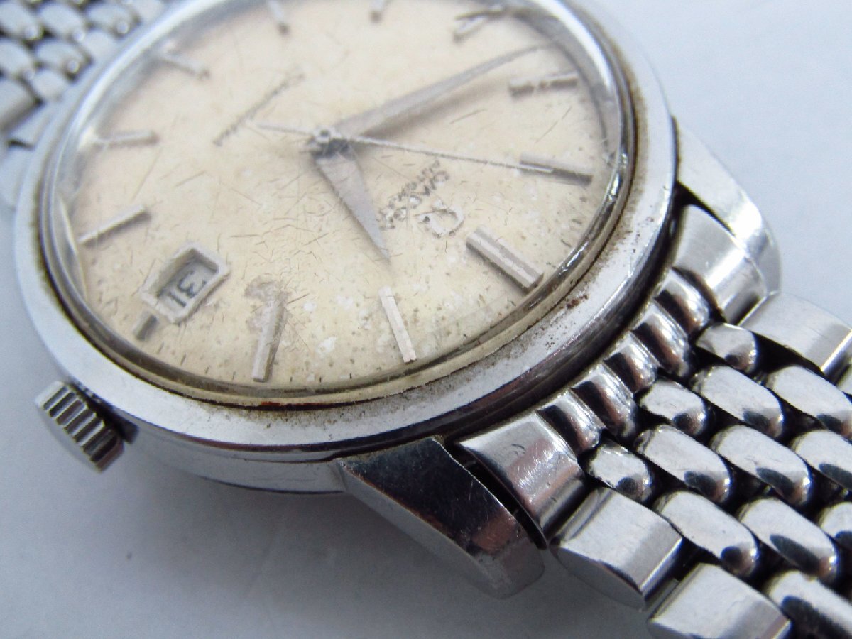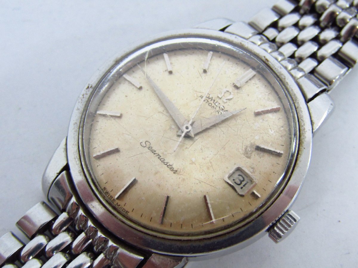 ※こちらは一般のお客様から買取をした中古商品です。 【状態】 かなりの使用感、全体に擦れや傷、サビ、風防傷・ヒビ、文字盤変色・サビ・汚れなどがございます。 動作・稼動品です。 【詳細】 ブランド:オメガ/OMEGA モデル名:シーマスター 性別:メンズ ケース素材:SS ベルト素材:SS 文字盤色:シルバー 機械タイプ:自動巻き Ref.No:Ref.166.011-63 機能・特徴:デイト 付属品:なし(本体のみ) ケースサイズ:約 36mm ベルトサイズ:約 19cm ラグ幅:18mm 振動数:19800 日差: -6秒/日 OH歴:弊社では実施しておりません。 | |||||||