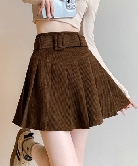 エレガントなプリーツディテールが施されたミニコーデュロイスカートです。共布ベルトがウエストをキュッと引き締め、スタイルアップをサポートします。