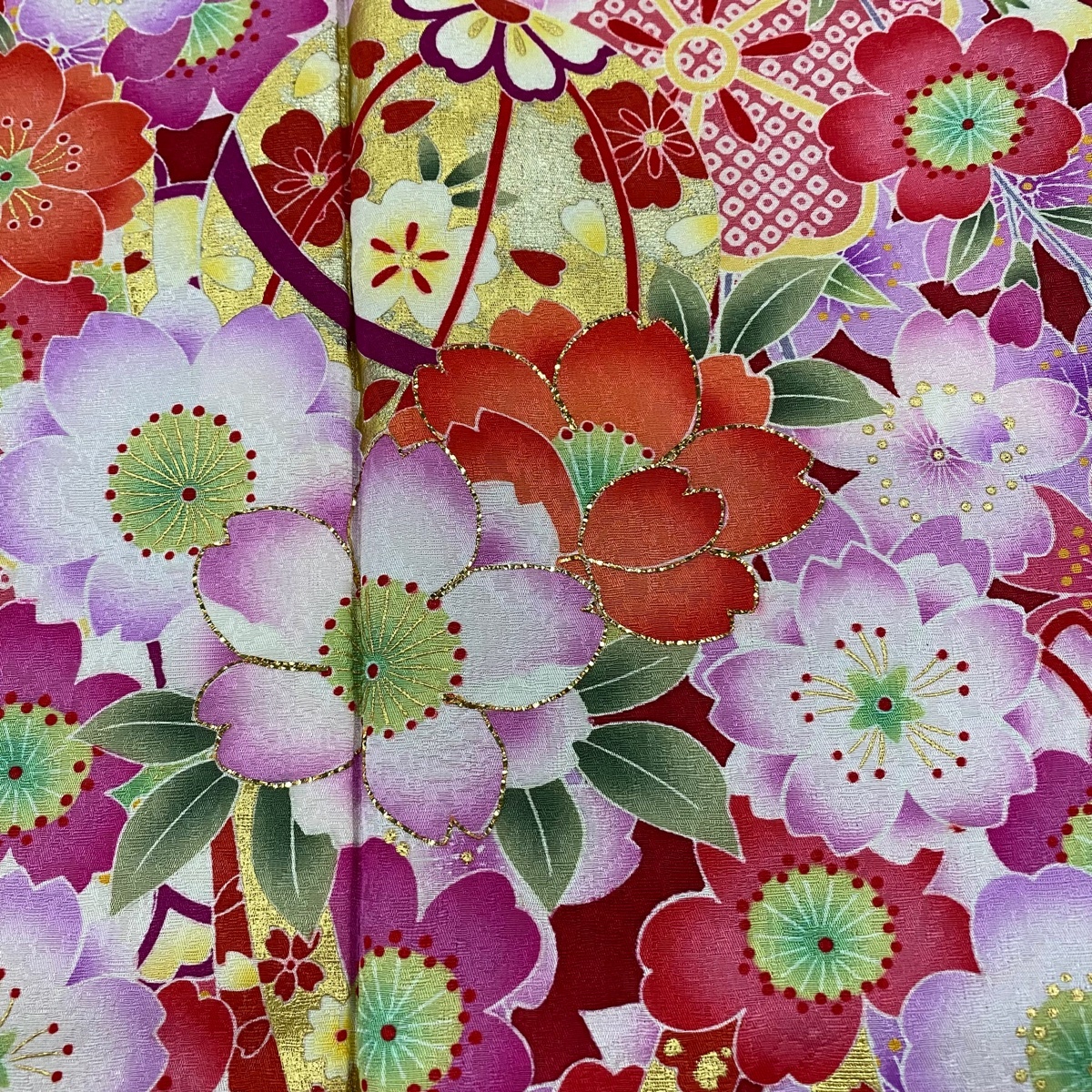 振袖 名品 桜 手鞠 金彩 ラメ 赤 袷 身丈162 裄丈68 L 正絹 【中古】 |