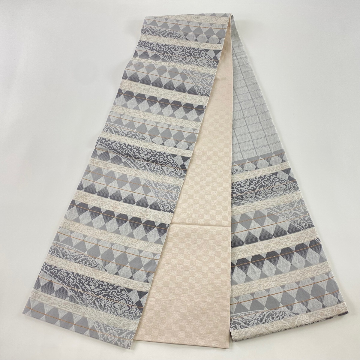 | 袋帯 美品 名品 ますいわ屋 横段 幾何学 ラメ糸 箔 灰色 六通 正絹 【中古】 |