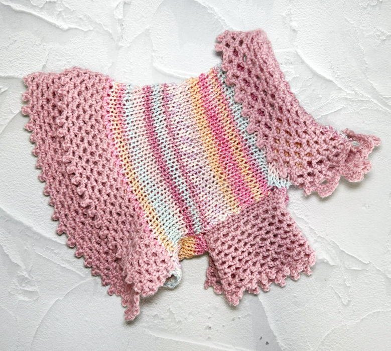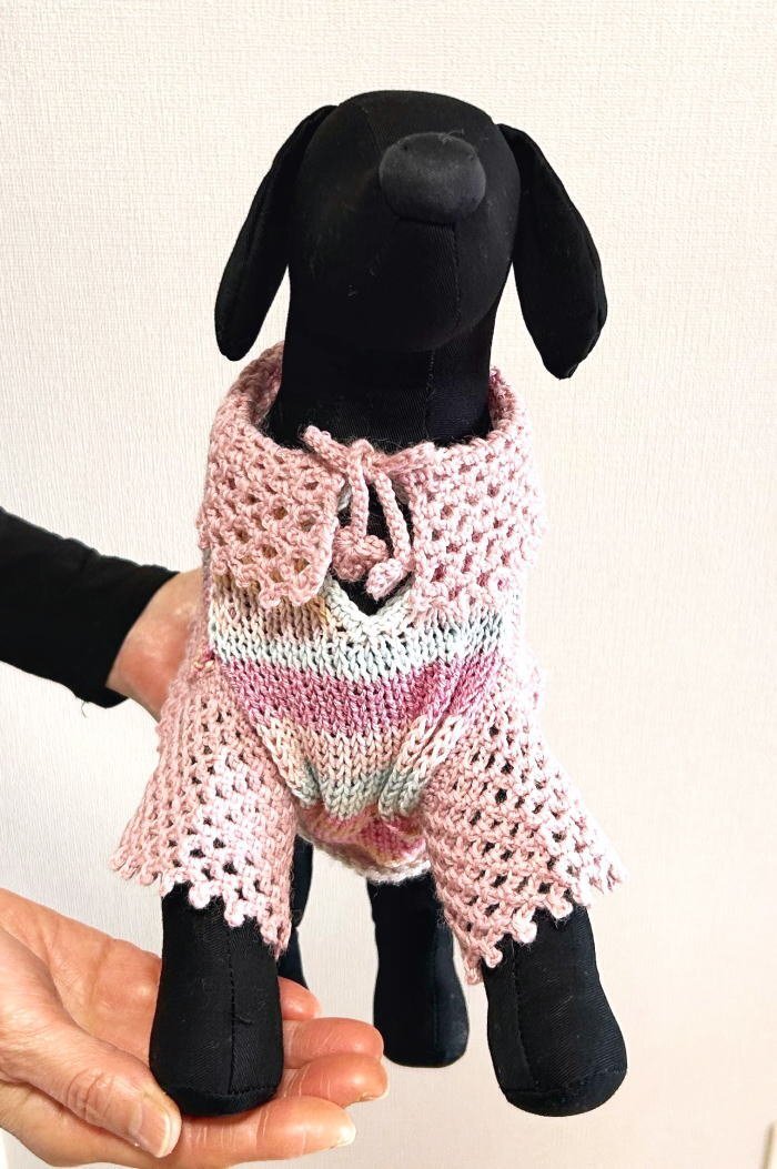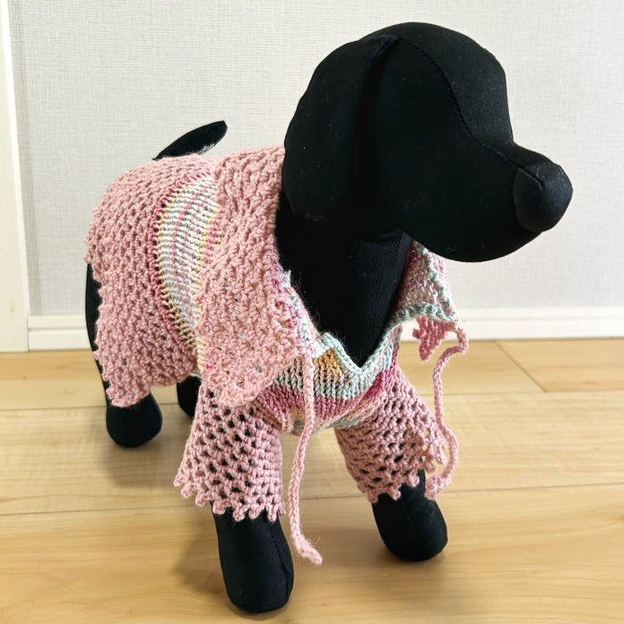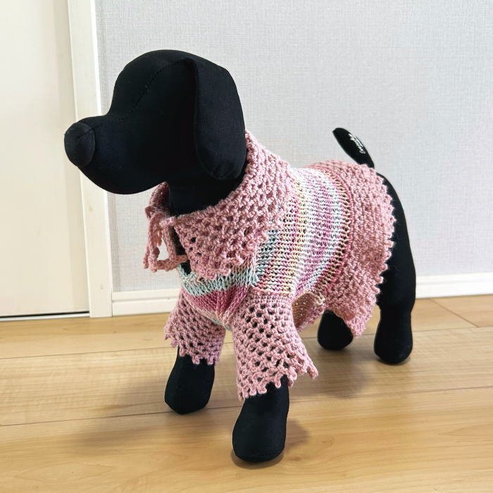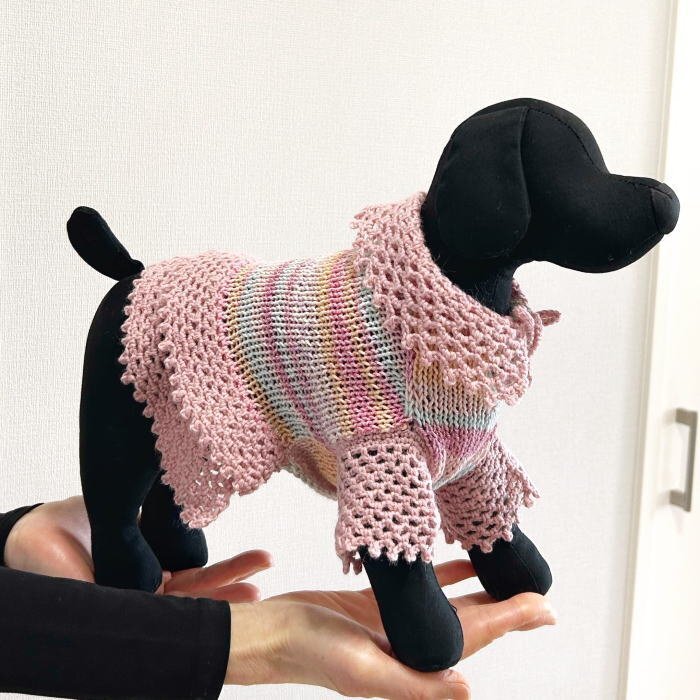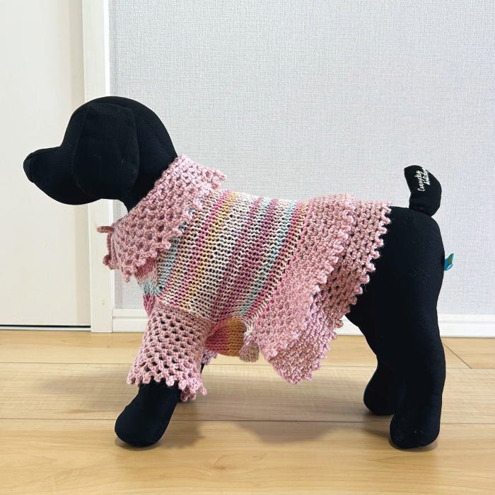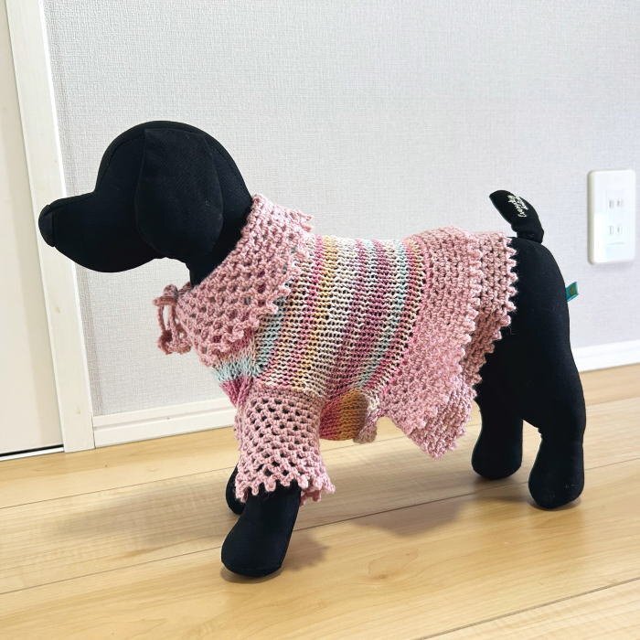 フリルが可愛いワンコ服は、本体を段染め毛糸のナイフメーラで、フリルをスーパーウォッシュアルチザンの単色で仕上げています