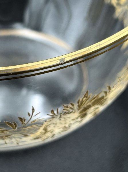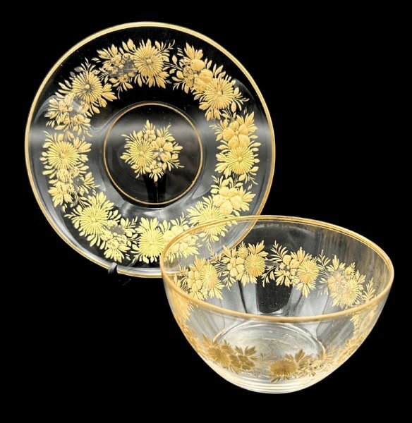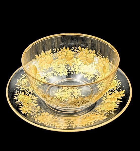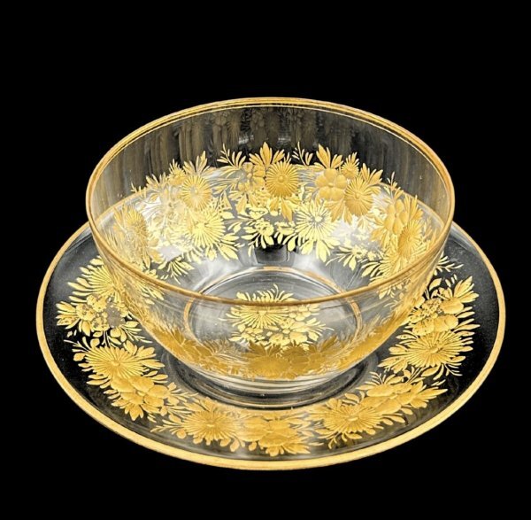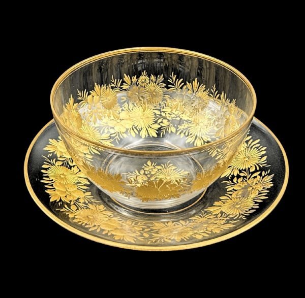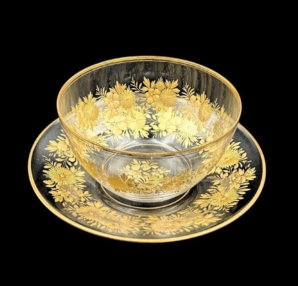 本作はボヘミアの名門「Moser(モーゼル)」による1900年代初頭の作品で、クリスタルガラスの透明感を活かしつつ、全面に豪華な金彩を施した華麗なデザートボウル&ソーサーです。