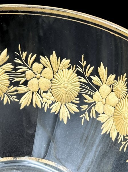 高い透明度を誇るクリスタルガラスに、華麗な金彩で百花繚乱の花模様が施された、まさに芸術品と呼べる逸品です。