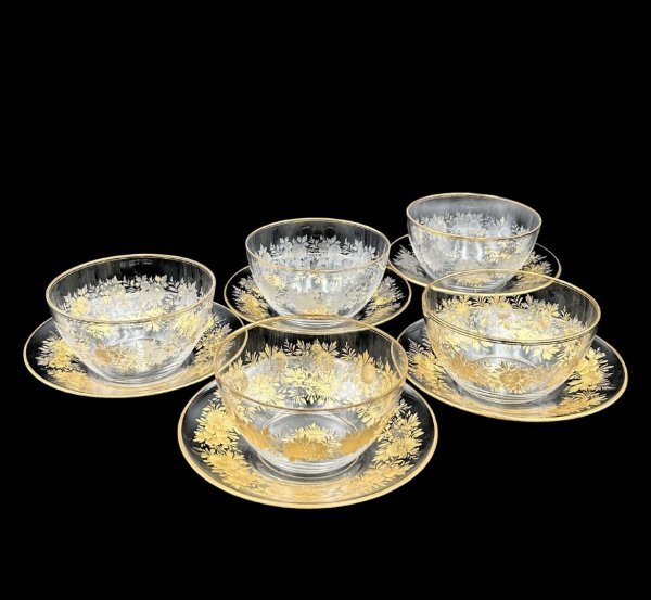 【希少】Moser(モーゼル) ボヘミア アンティーク デザートボウル ソーサー 5客 クリスタルガラス 豪華金彩 百花繚乱 1900年頃 F005