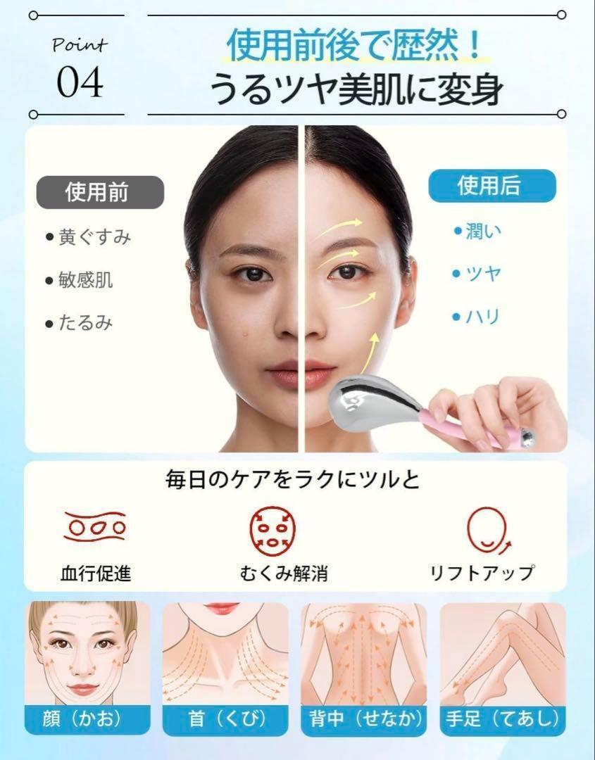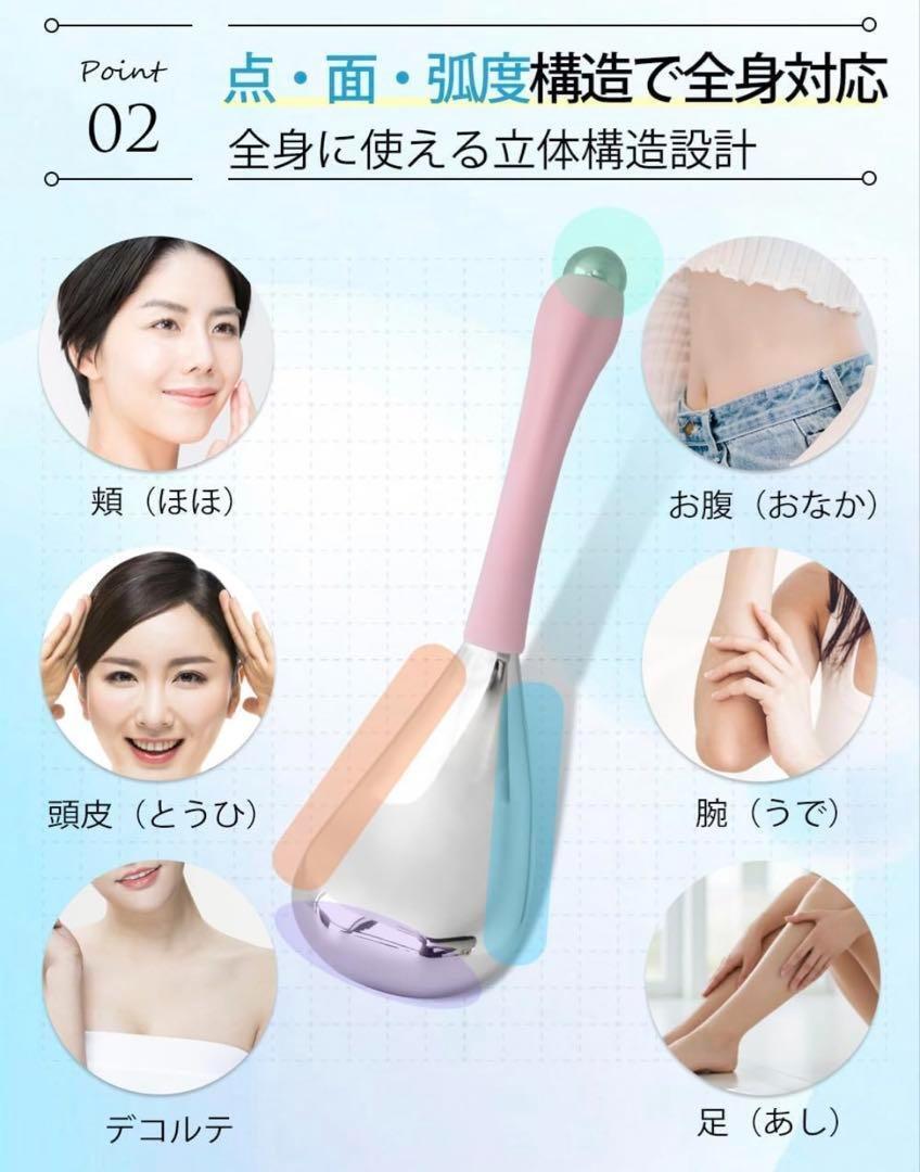 本製品は、顔・首・肩・背中・腕・腰・脚など、全身のあらゆる部位に対応可能な多機能設計を採用しています。