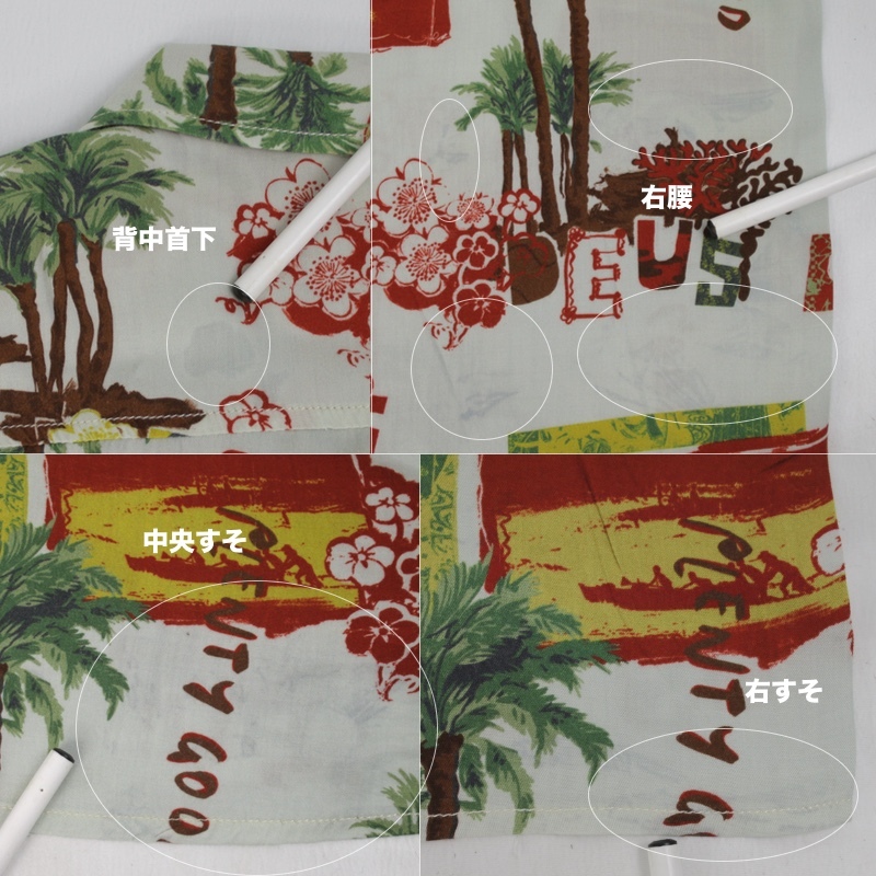 柄の中で、グレーっぽい部分、最初は絵柄の背景のように見えましたが、柄模様のインク移り、シミのようです。主に右脇腹、すそ、背中側首下、右腰、すそなどです。言われなければそのような柄なのか、わからないと思います。