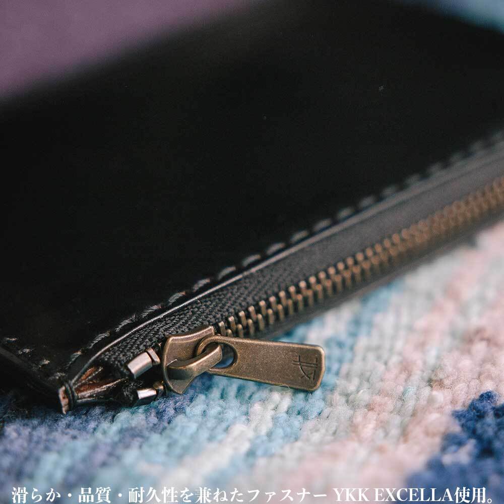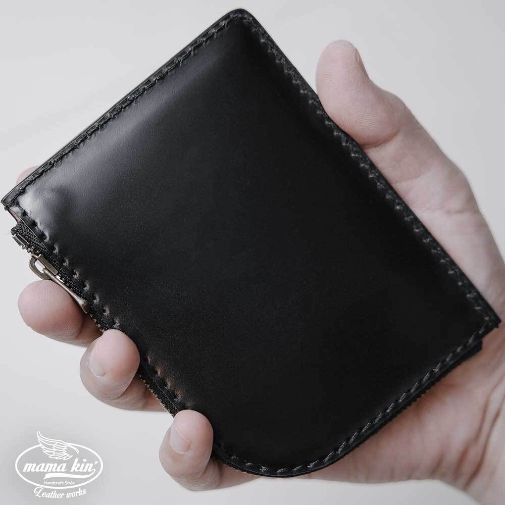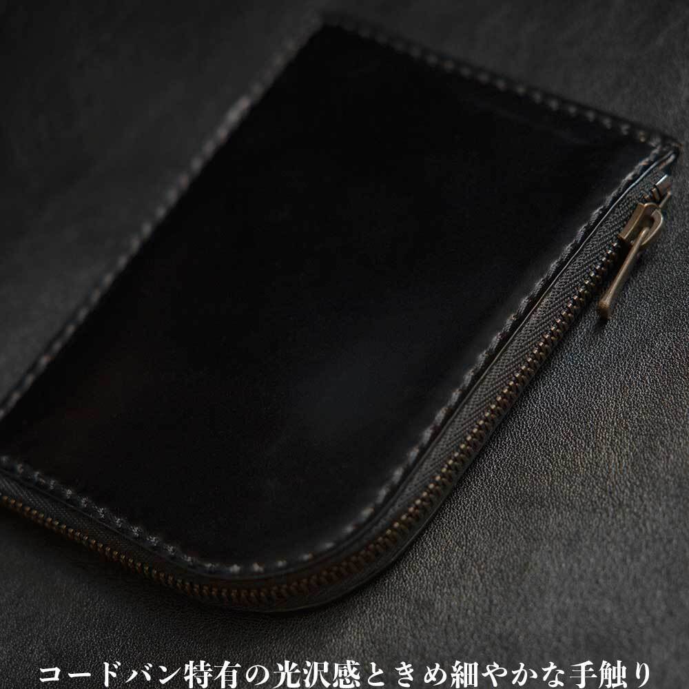 コードバンの深い色合いと滑らかな手触りが魅力の財布革表面の光沢感となめらかな手触り。