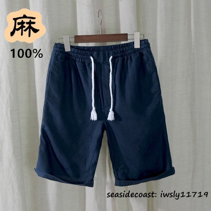 夏新品 ショートパンツ メンズ 麻100% 無地 短め 薄手 涼しい ハーフパンツ 半ズボン リネンパンツ 短パン 通気性 カジュアル ネイビー M