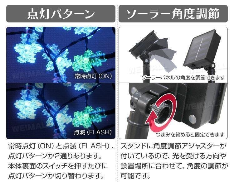 | ソーラーパネルで充電するので、電源不要で電気代0円! 経済的でエコなイルミネーションです。 暗くなると自動で点灯、明るくなると自動で消灯する明るさセンサー付きなのでとても便利! 使用しない場合は電源をOFFにしておけば暗くなっても光りません。 電源をコンセントから取らなくていいので、 日の当たるソーラーパネルを置くスペースさえあればどこでも楽しむことが出来ます。 お庭の植え込みに、テラスやベランダに! クリスマスイルミネーションにピッタリ!ハロウィンもピッタリです♪ ■商品コード:ACA04070 種類:雪の結晶 サイズ(約): ・ソーラー本体:7.2×7.2×2.3cm ・支柱:21.5cm 重量(約):270g LED数:50球 点灯パターン:2パターン(常時点灯、点滅) フル充電時点灯時間:最大8時間 ※時間は目安で、使用環境により異なります。 充電時間5~8時間 ※環境により充電時間は伸びます。 カラー:ミックスカラー(ブルー、レッド、グリーン、イエロー) ソーラーパネル:2V/100mA バッテリー:ニッケル水素電池(NiMH) 600mAH 電源から電球までの長さ(約):2m コードの長さ(約):7m コードの色:ダークグリーン 防水性能:防水 防滴型 連結不可 ■注意事項 ・点灯時間は、お使い頂く地域、設置場所、季節や天候の日照条件に左右されます。 日照時間が短い場合、必要な電力が充電できず、点灯時間が短くなることがあります。 ・夜間、周囲が明るくなる場所に設置すると、照度センサーが感知せず点灯しない場合があります。 ・防雨構造となっておりますが、常時水のあたる場所や水中等、極端な使用はしないで下さい。 故障の原因になりますのでご注意下さい。 ・商品の特性上色のバラツキ、明るさが多少異なる場合がございます。予めご了承お願いします。 ・LED不良率5%以下につきましては保証対象外とさせていただきます。 ・入荷時期により、多少色味が異なる場合がございます。初期不良対象外となりますのでご了承下さい。 ・写真と実物は多少異なる場合がございます。あらかじめご了承下さい。 ■保障期間 7日間 ※商品到着後7日以内の初期不良・破損のみご対応させていただきます。 【もちろん新品未使用品です】 |