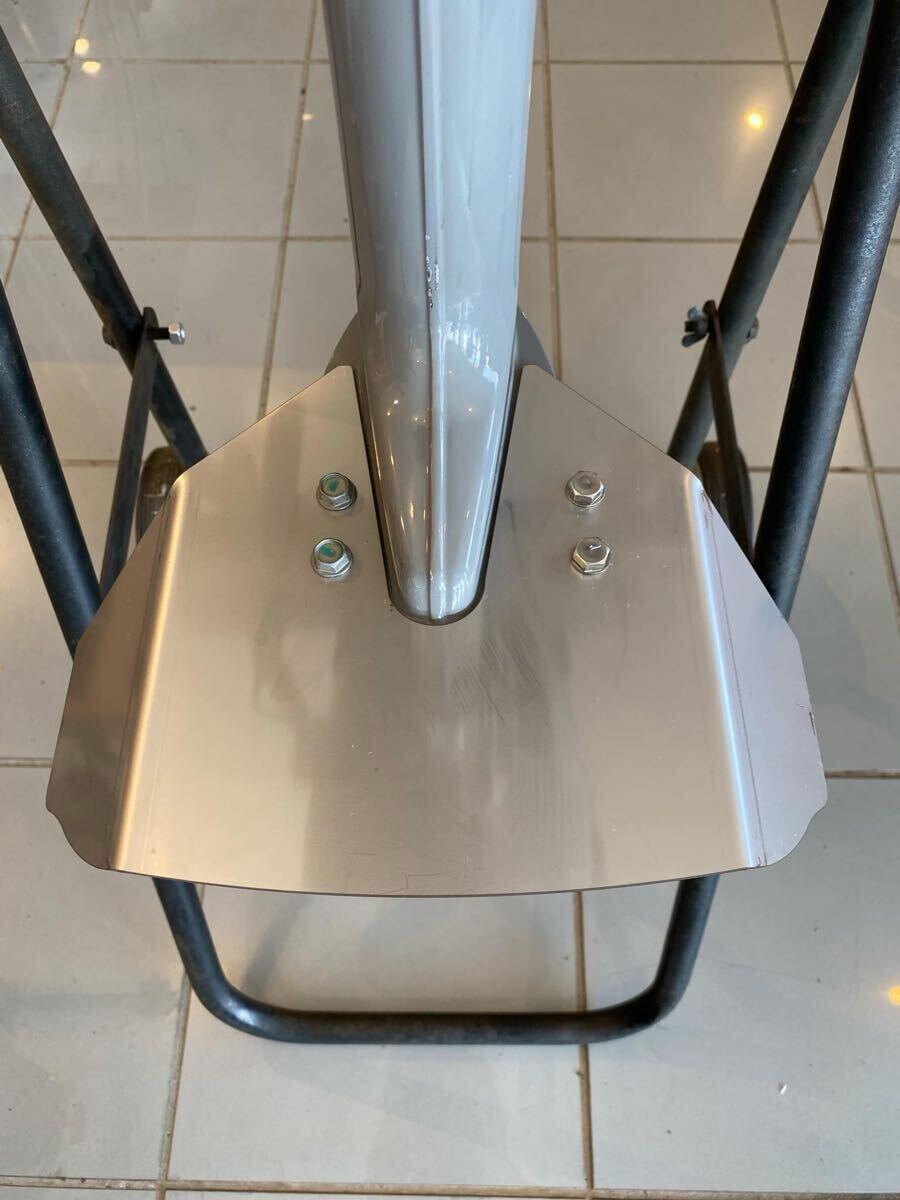 | HONDA ホンダ 2馬力 船外機用 スタビライザー BF2D・BF2DH共用 低価格の穴あけ加工不要タイプ 大量に製造出来る様にした事でお安くなりました。 板厚2mmで強度も抜群です。 旧タイプ(BZBF)対応 現行タイプ(BAAC)対応 【スタビライザーの効果】 滑走(プレーニング)というのは物体を支えるのに浮力よりはるかに大きな揚力が作用して航走している状態をいいます。 船底に働く揚力によって艇体が持ち上げられ、滑走状態になるとバウが下がり水に対して3°~5°のトリム角(縦傾斜)で水面を滑るように走行するのが特徴です。 よってスタビライザーも3°~5°のトリム角で常に裏面に働く揚力が発生します。 それによって船外機が持ち上げられ滑走状態により早く持ち込みます。 様々な形状のスタビライザーでテストしましたが、格好良いのですが、スタビライザーの左右を平行90°曲げてしまうと、スタビライザー裏面に当たった水の逃げ場が分散されず後方だけになり、滑走状態時に流速が追いつかず滞留してしまい、スタビライザーの揚力が落ちてしまいプレーニング効果が落ちる傾向にあります。 強度を保つのにスタビライザー本体の曲げは必要です。 強度を保つ最低限の折曲げで、尚且つ後方に水が流れ易くなる様、後方に広がるテーパー状に曲げ加工を施し流速を確保しプレーニング効果が落ちない様、本製品は設計されてます。 是非、本スタビライザーの効果を体感してみて下さい。 滑走状態が長い程、燃費もかなり良くなります。 材質:SUS304(ステンレス) 2B材使用 2.0mm レーザーカット後折り曲げ加工 塩害(サビ)に強く、曲げ加工により強度は抜群です。 船外機を横置きした場合もペラを保護してくれます。 (海水にて使用しましたが全くサビません) 船外機への加工は不要です。 (左側はアノードメタル共締めで右側は付属のプレートで本体を挟み込む様に取り付けます※(画像参照)プレート及び取付ボルトは付属します(ステンレス製) 船外機下部へのプロペラからの水の跳ね上げがかなり軽減されます。 (エンジンへの海水の飛散が減ります) 当方オリジナル製品となります。 注)加工時に付くキズ、油、焼け、ドロスの付着、バリ等御座います。 全ては画像にて判断願います。 |