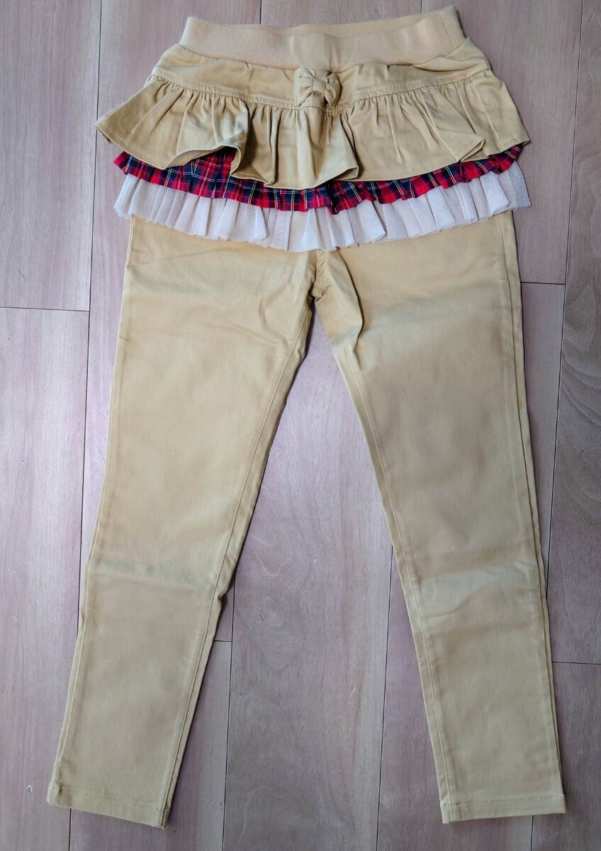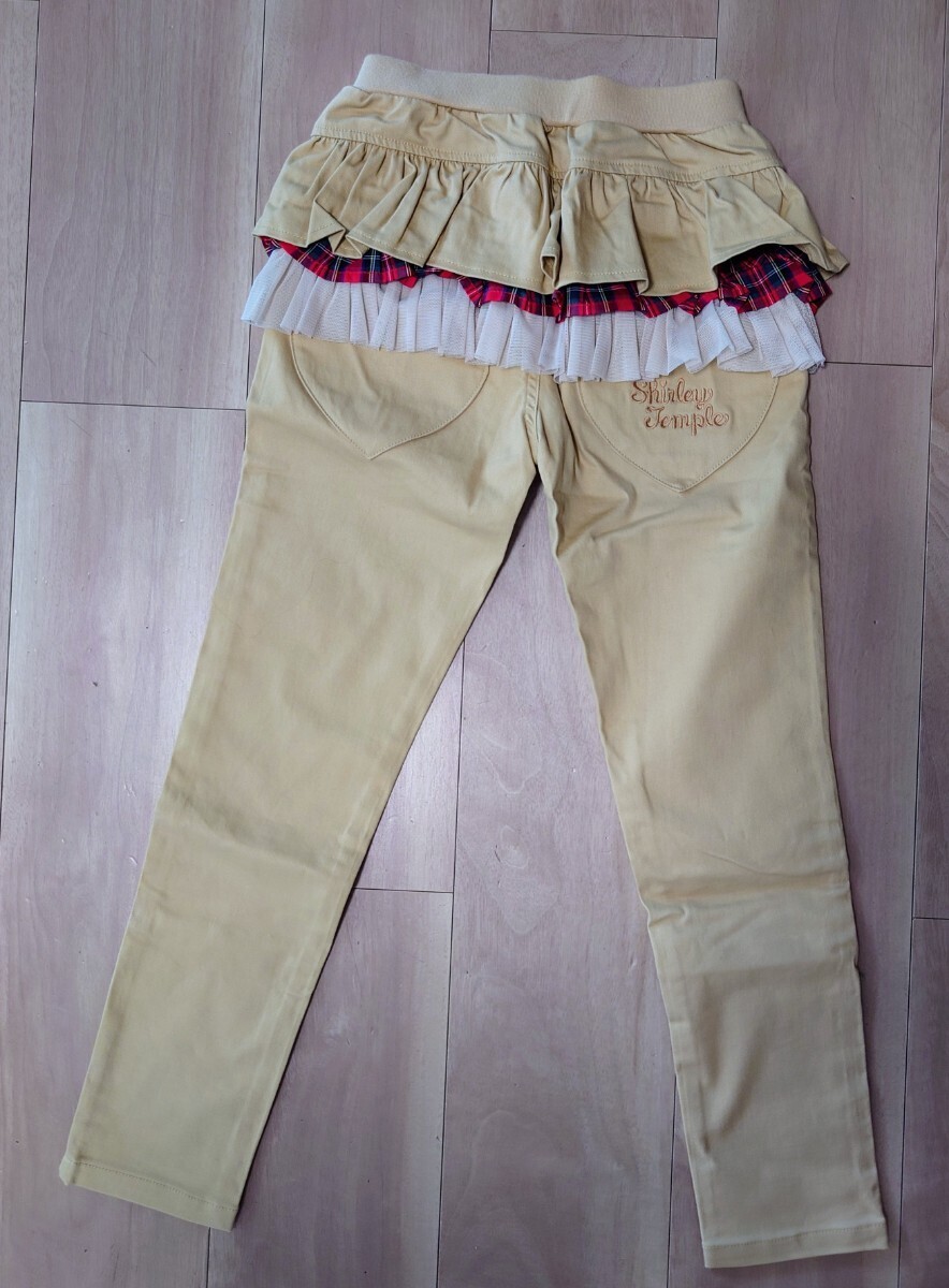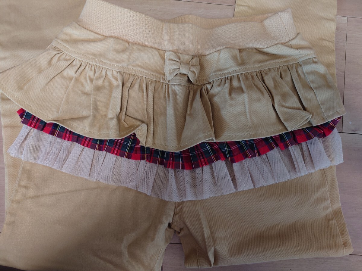 子どもに着せようと思って購入したものですが、使わないままにサイズアウトしたものです。タグ付きのままです。確認する限り、シミ、汚れはありません。ポケットはお尻のハート部分2箇所です。少し細身の作りかなと思います。