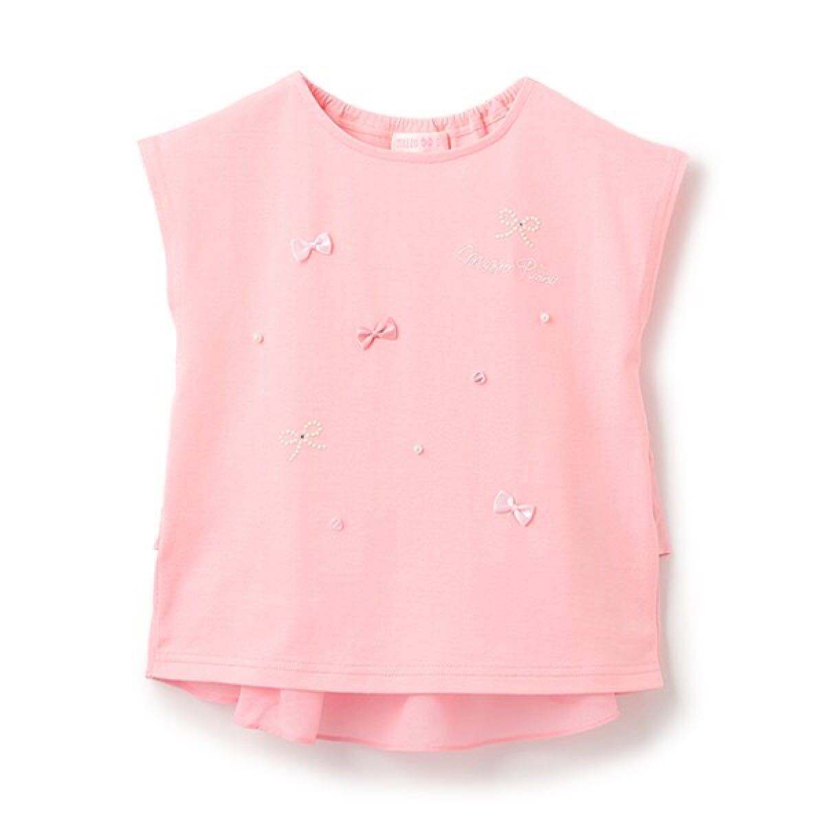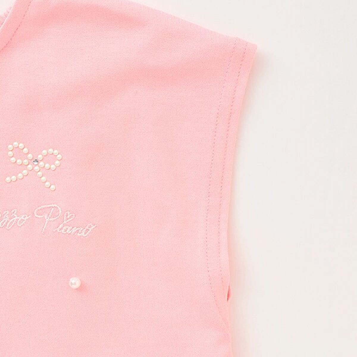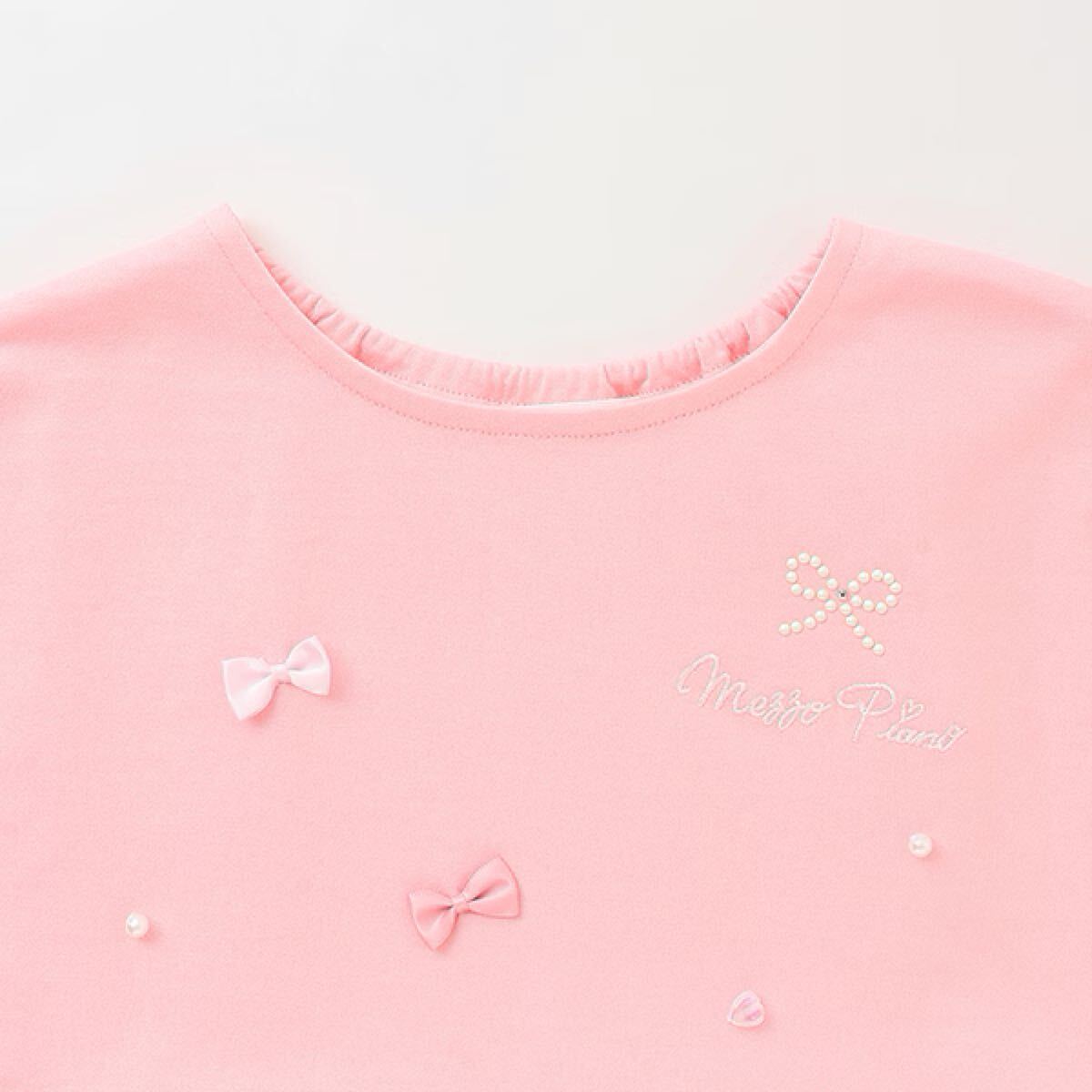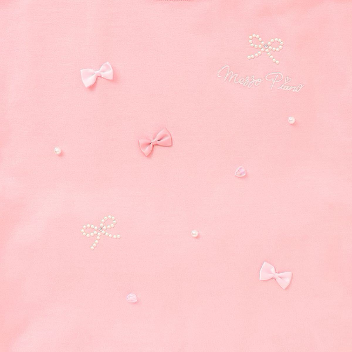 パールやキラキラのハートパーツ、立体のリボンがちりばめられたTシャツです。