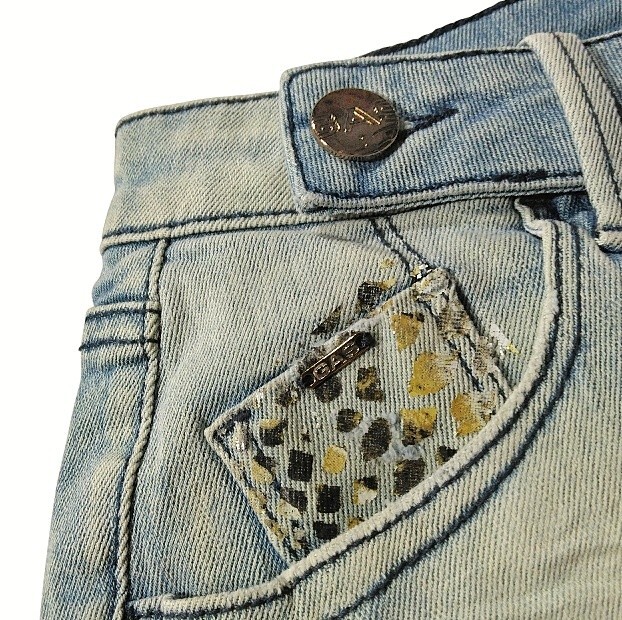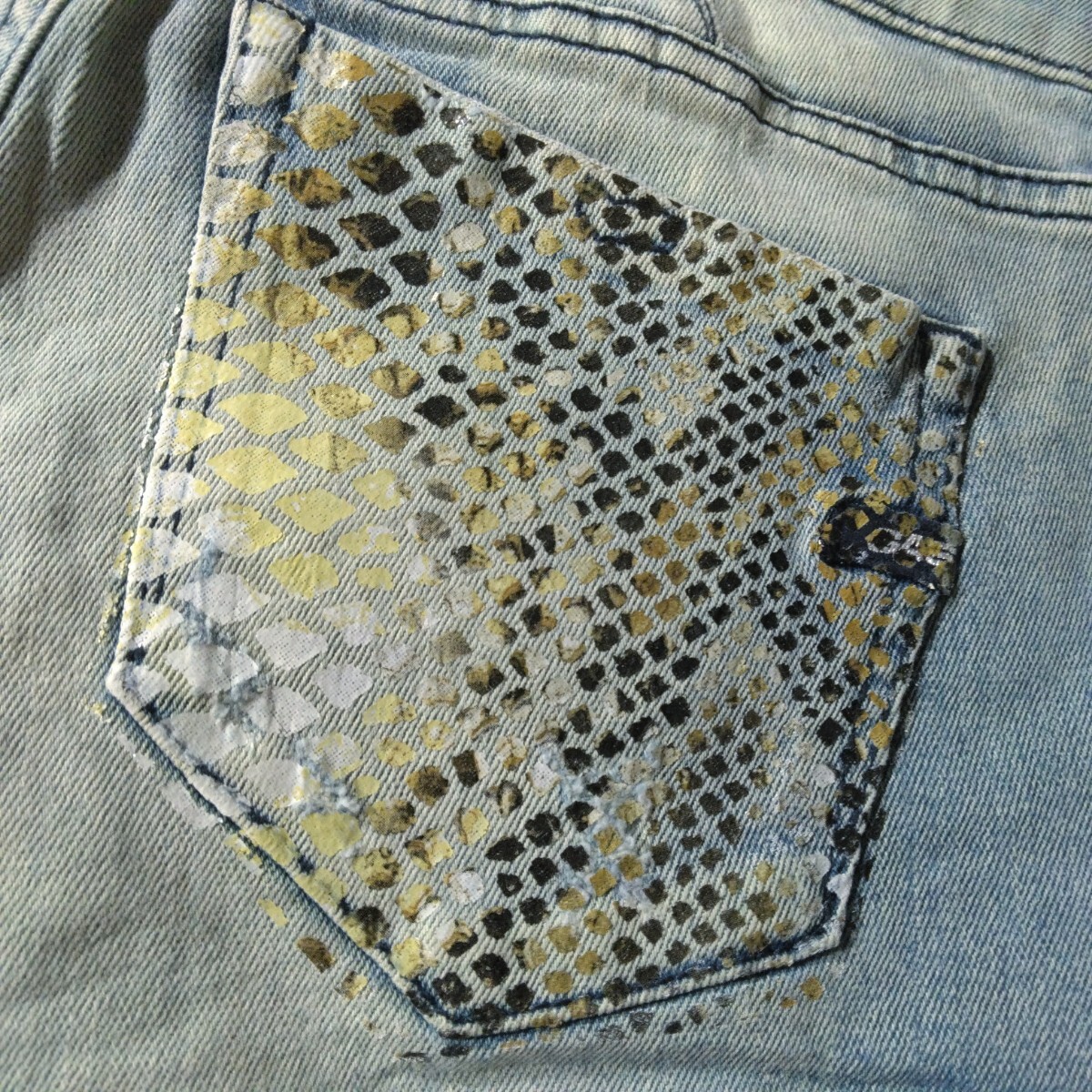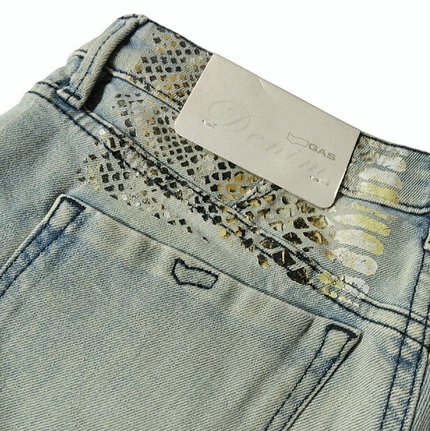 所々にダメージ加工あり、ポケットなどにパイソン柄のようなプリントありでアクセントになってます♪